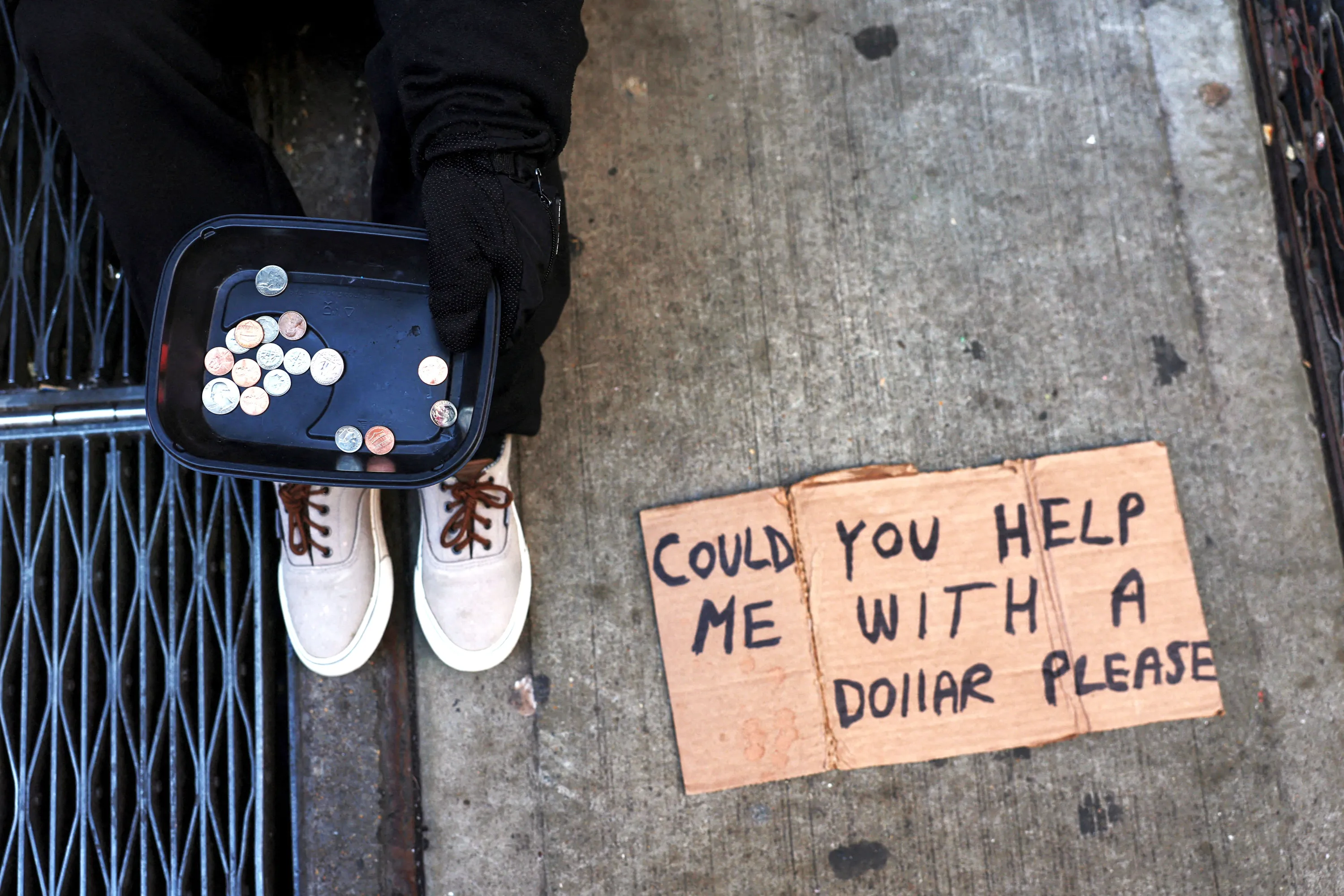 A man, 21, who said he was from Peru and has been homeless for around one year, shows a tray that he uses to collect spare change on a 44th street sidewalk in the Times Square area of New York City on March 12, 2024. (Photo by Shannon Stapleton/Reuters)