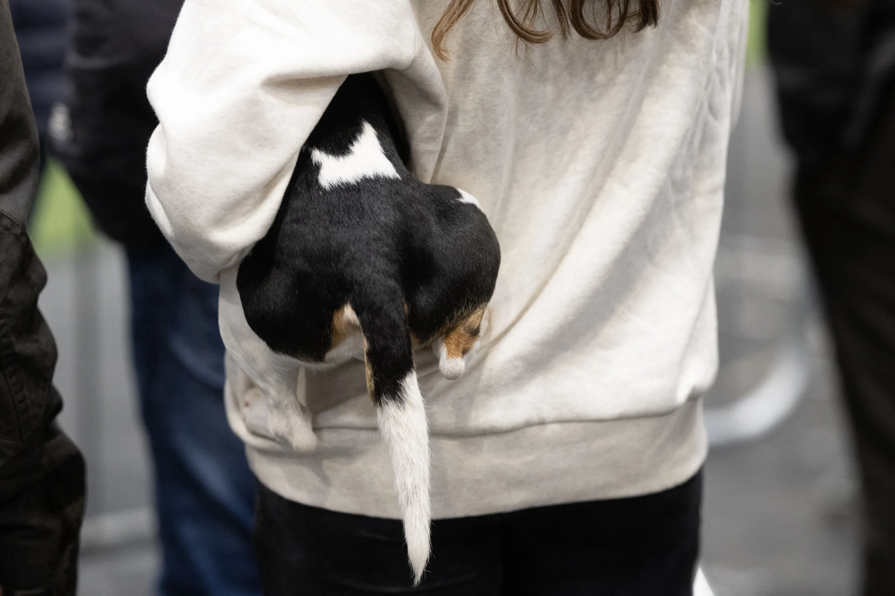 A woman holds a dog as she views an dog agility performance on the last day of the Crufts dog show at the National Exhibition Centre in Birmingham, central England, on March 10, 2024. (Photo by Oli Scarff/AFP Photo)