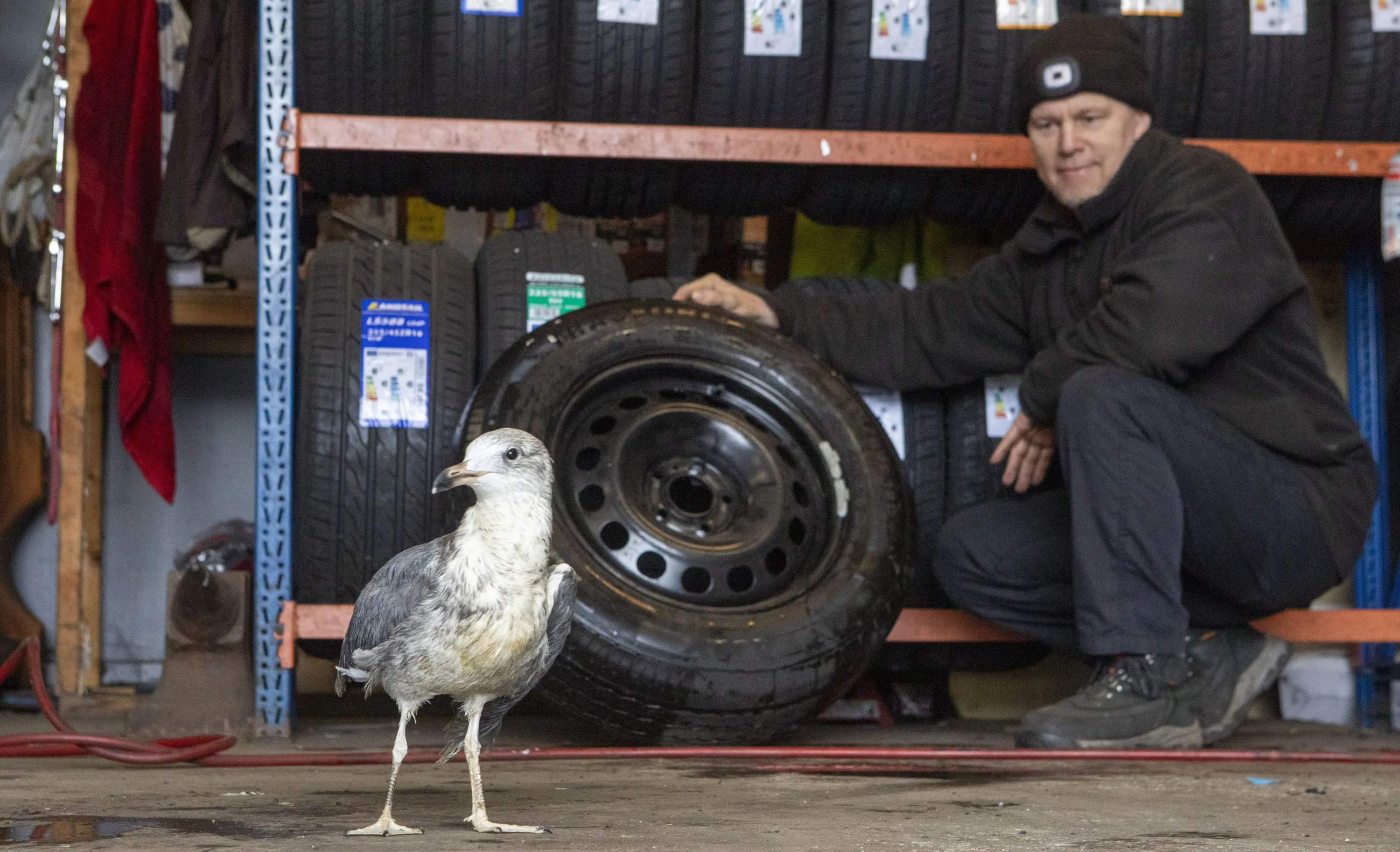 Bruce Garden, a car mechanic, has become best pals with a seagull he named Hopeful. He nursed the injured bird back to health when he found it with a badly damaged wing on the industrial estate in UK where he works. He has even made her a nest out of one of his old tyres. March 14, 2024. (Photo by Katielee Arrowsmith/South West News Service)