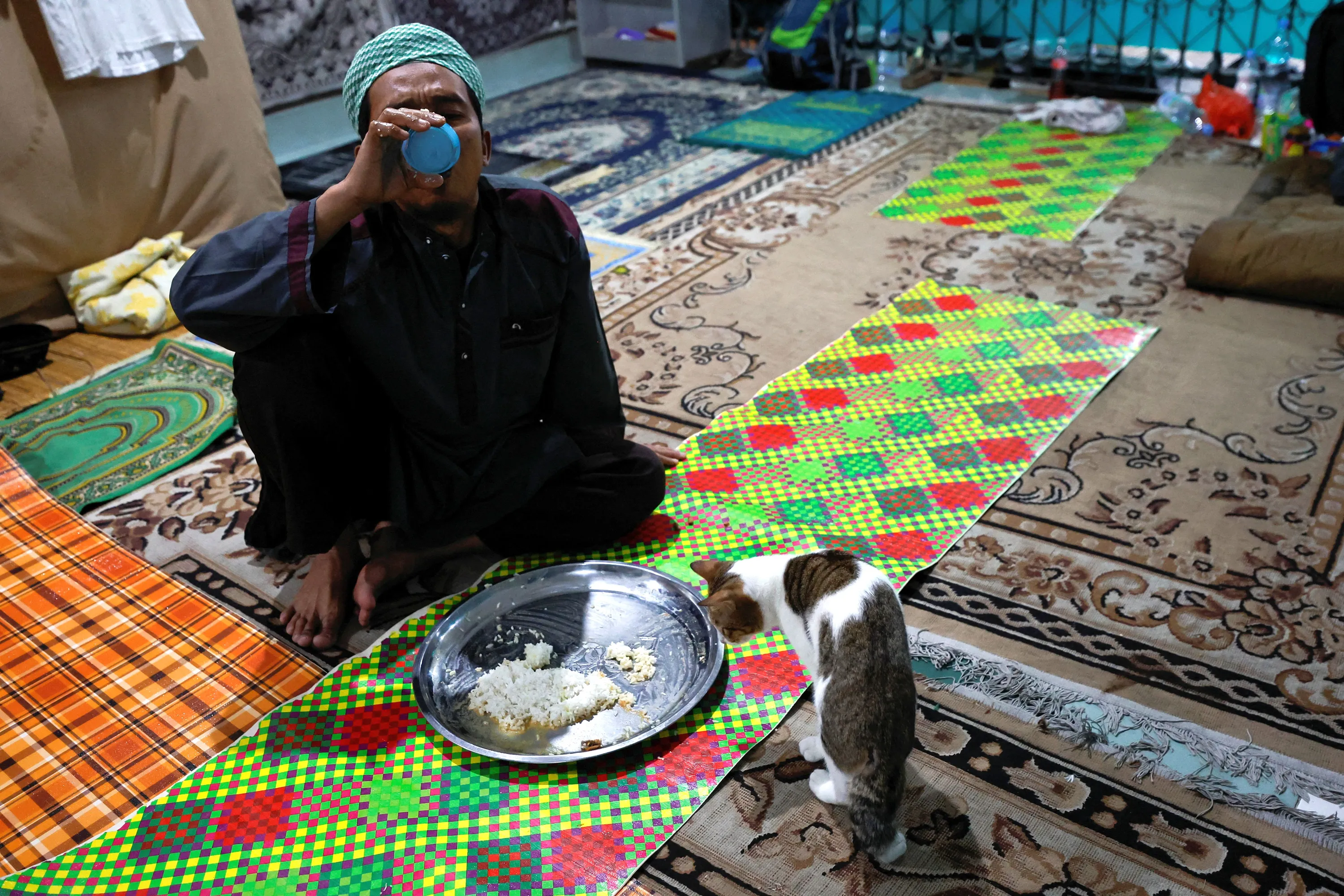A cat sits near an Indonesian Muslim man eating his iftar meal at Kebon Jeruk Jami' mosque during the holy fasting month of Ramadan in Jakarta, Indonesia on March 12, 2024. (Photo by Willy Kurniawan/Reuters)
