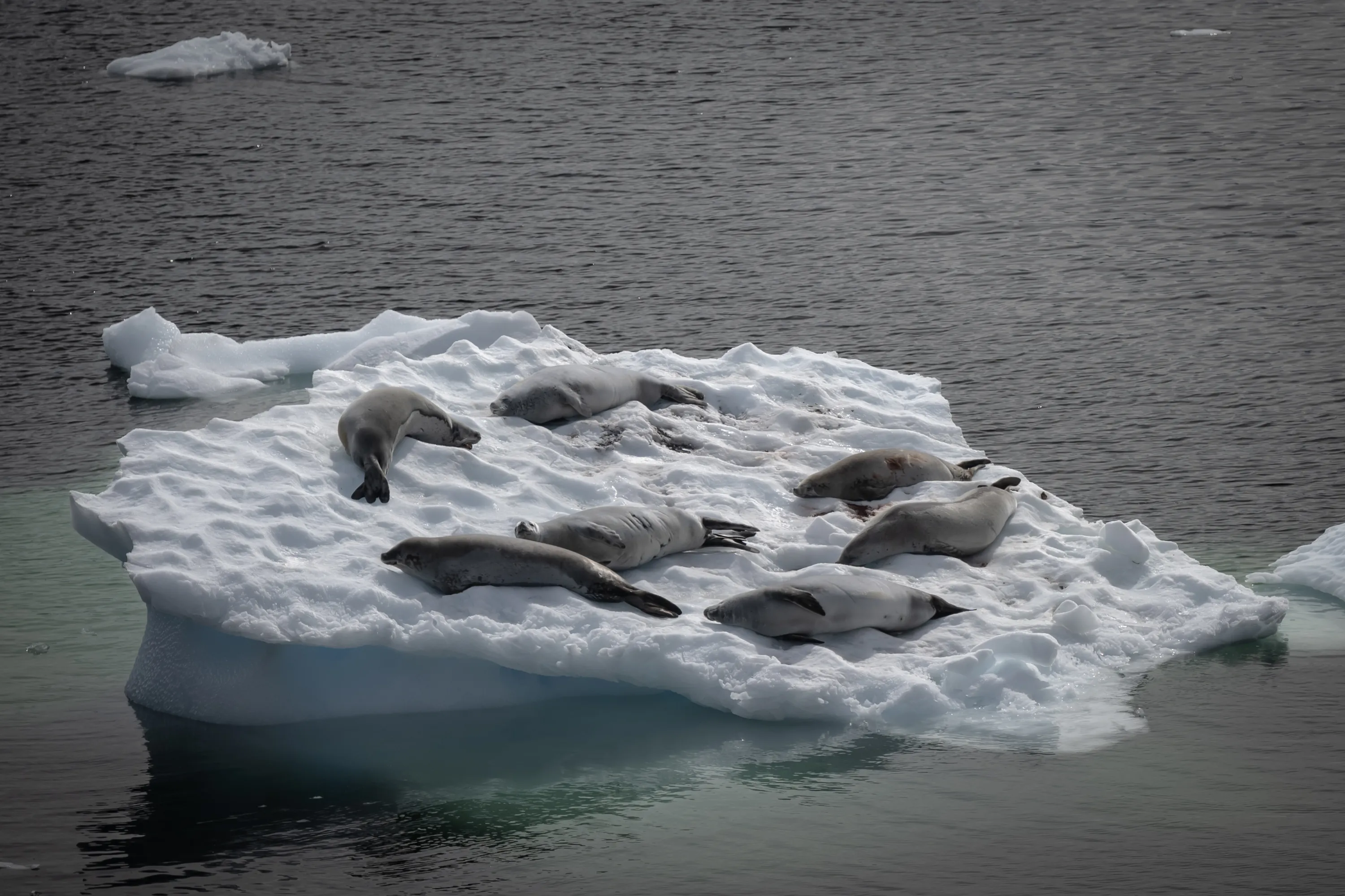 Crabeater seals on iceberg are viewed, in Antarctica on February 11, 2024. The 24-member team, which carried out the 8th National Antarctic Science Expedition, returned to Turkiye after completing all scientific activities following the 36-day expedition. National Antarctic Science Expedition, under auspices of Turkish Presidency, coordinated by TUBITAK MAM Polar Research Institute, examines impact of global climate change on glaciers. (Photo by Sebnem Coskun/Anadolu via Getty Images)