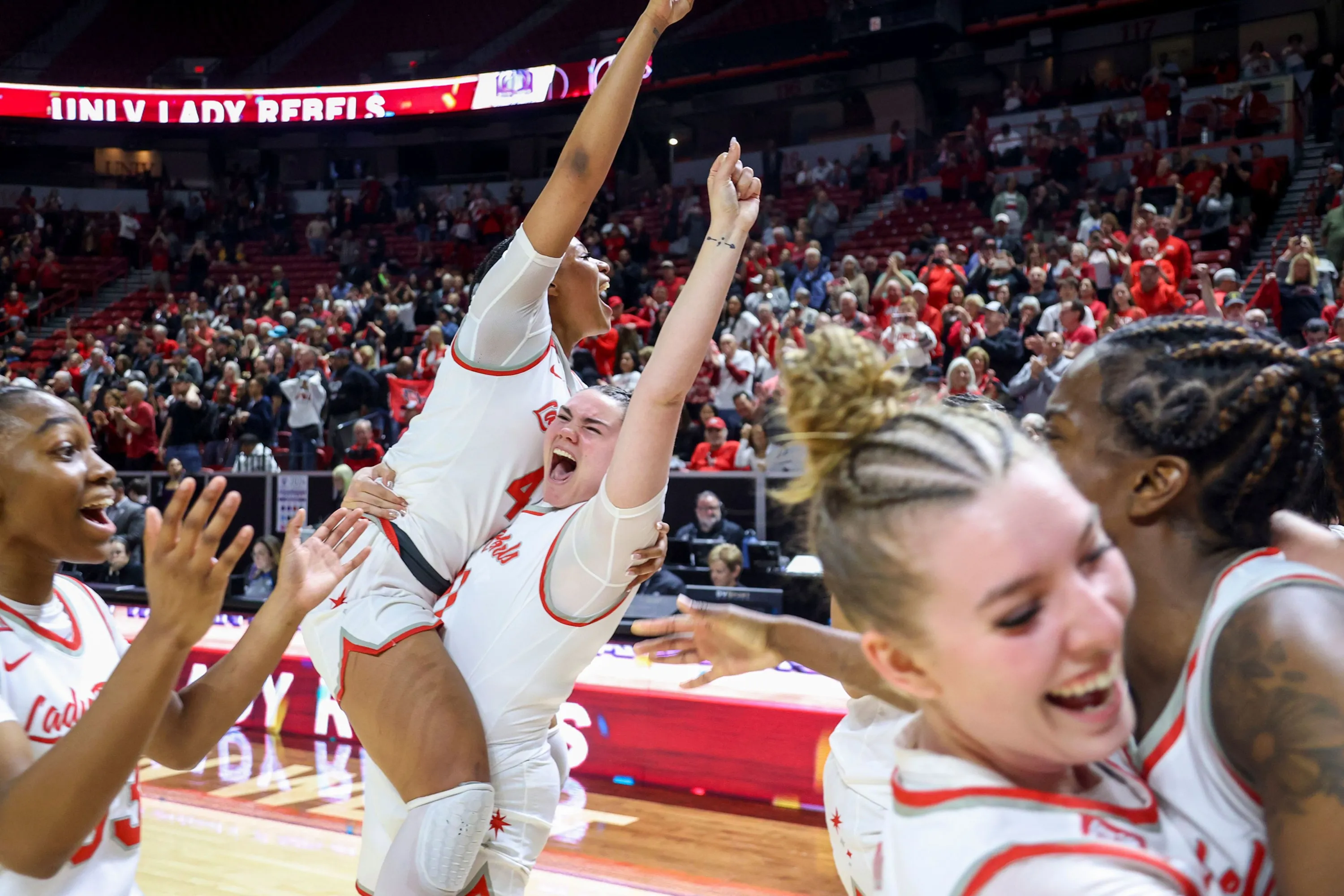 UNLV forward Alyssa Brown (44) and center Erica Collins (31) celebrate with teammates after a win over San Diego State in an NCAA college basketball game for the championship of the Mountain West women's tournament Wednesday, March 13, 2024, in Las Vegas. (Photo by Ian Maule/AP Photo)
