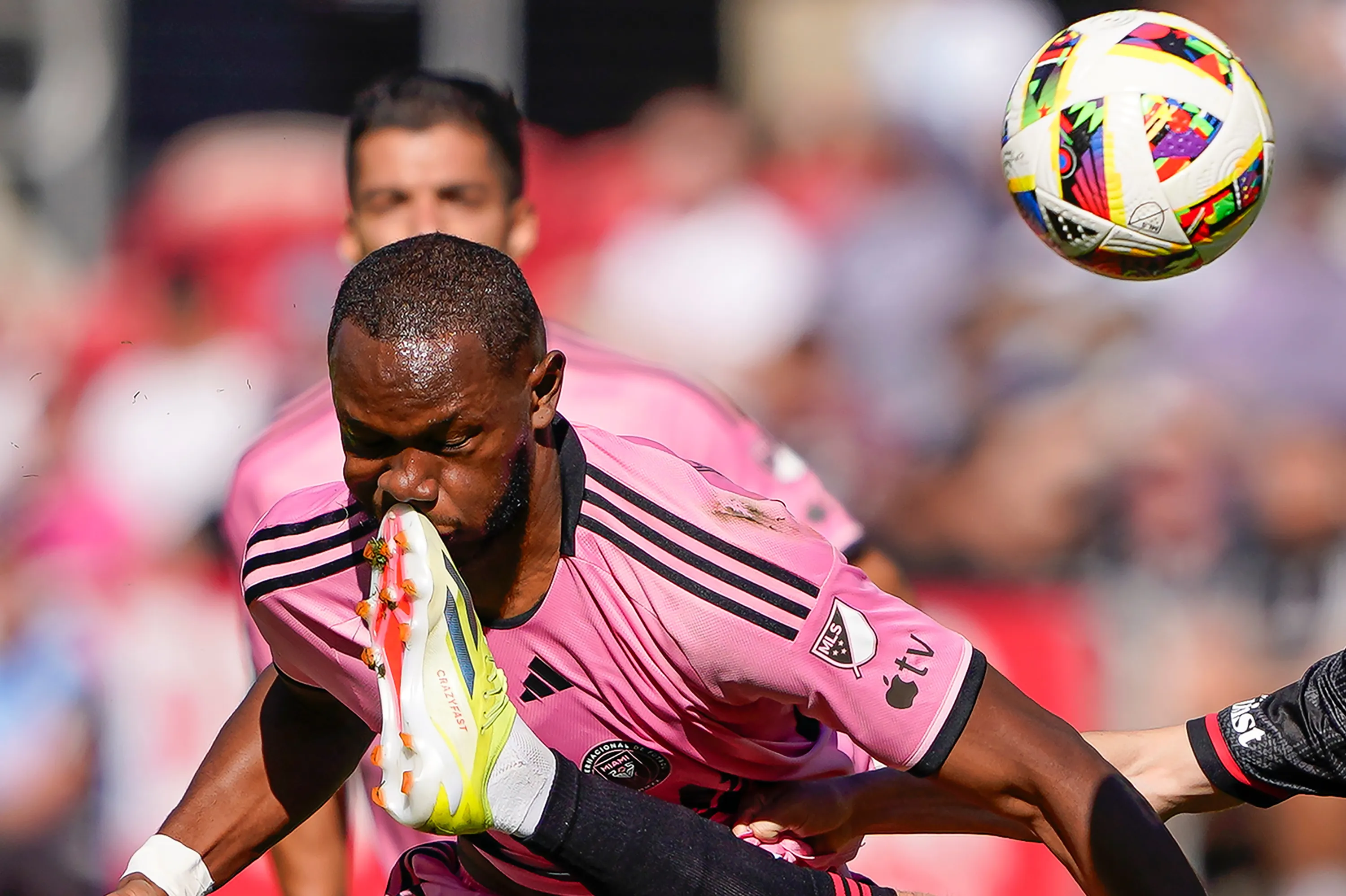 Inter Miami striker Shanyder Borgelin competes for the ball against DC United left wing back Pedro Santos during the second half of an MLS soccer match at Audi Field, Saturday, March 16, 2024, in Washington. (Photo by Nathan Howard/AP Photo)
