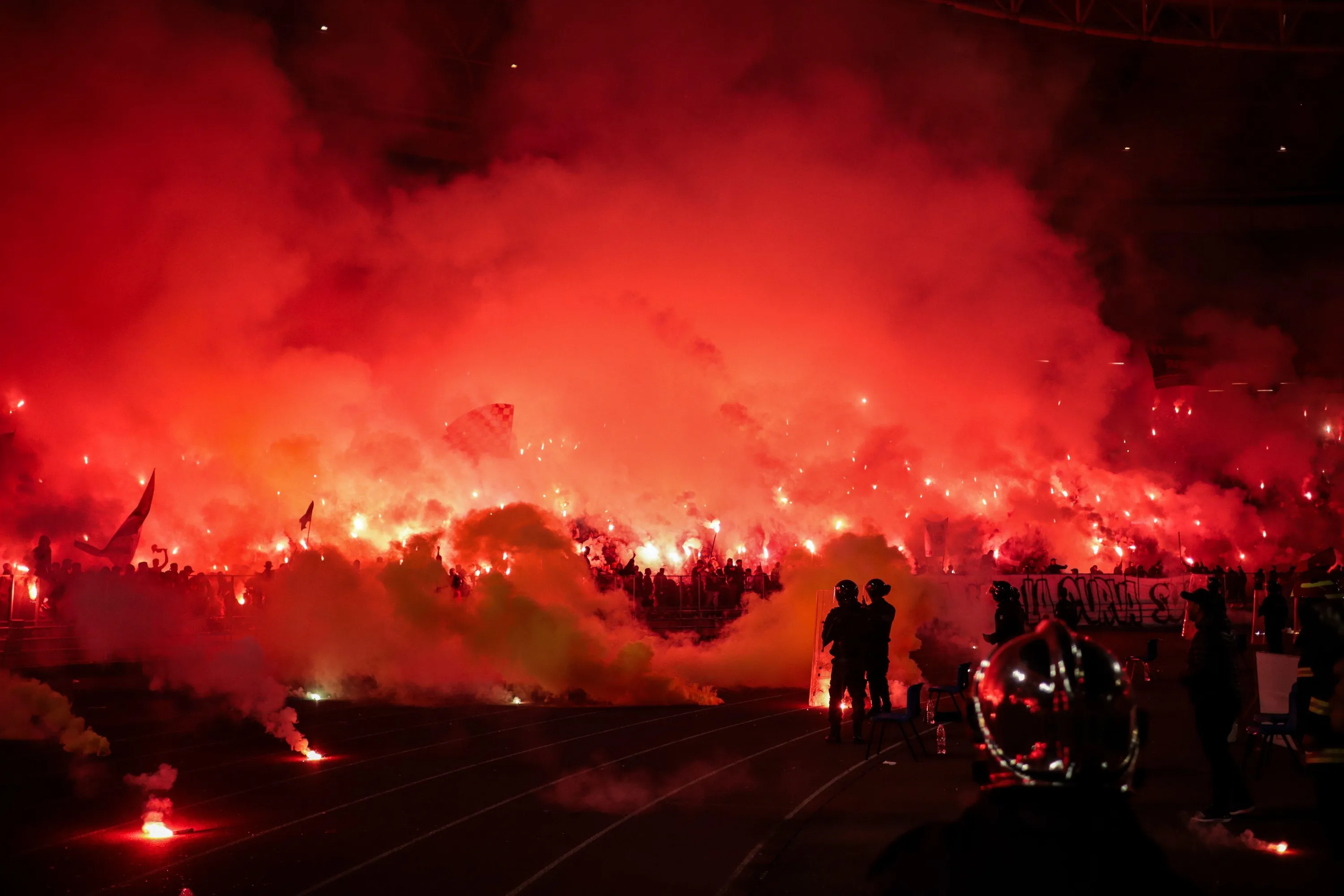 Police officers at the Rades stadium in flames during a football match between Esperance Sportive de Tunis and Club Africain (CA) in Tunis, Tunisia on March 16, 2024. The flames were allegedly ignited by EST football fans during the match, which is part of the Tunisia Championship (Photo by Hasan Mrad/IMAGESLIVE via ZUMA Press Wire/Alamy Live News)