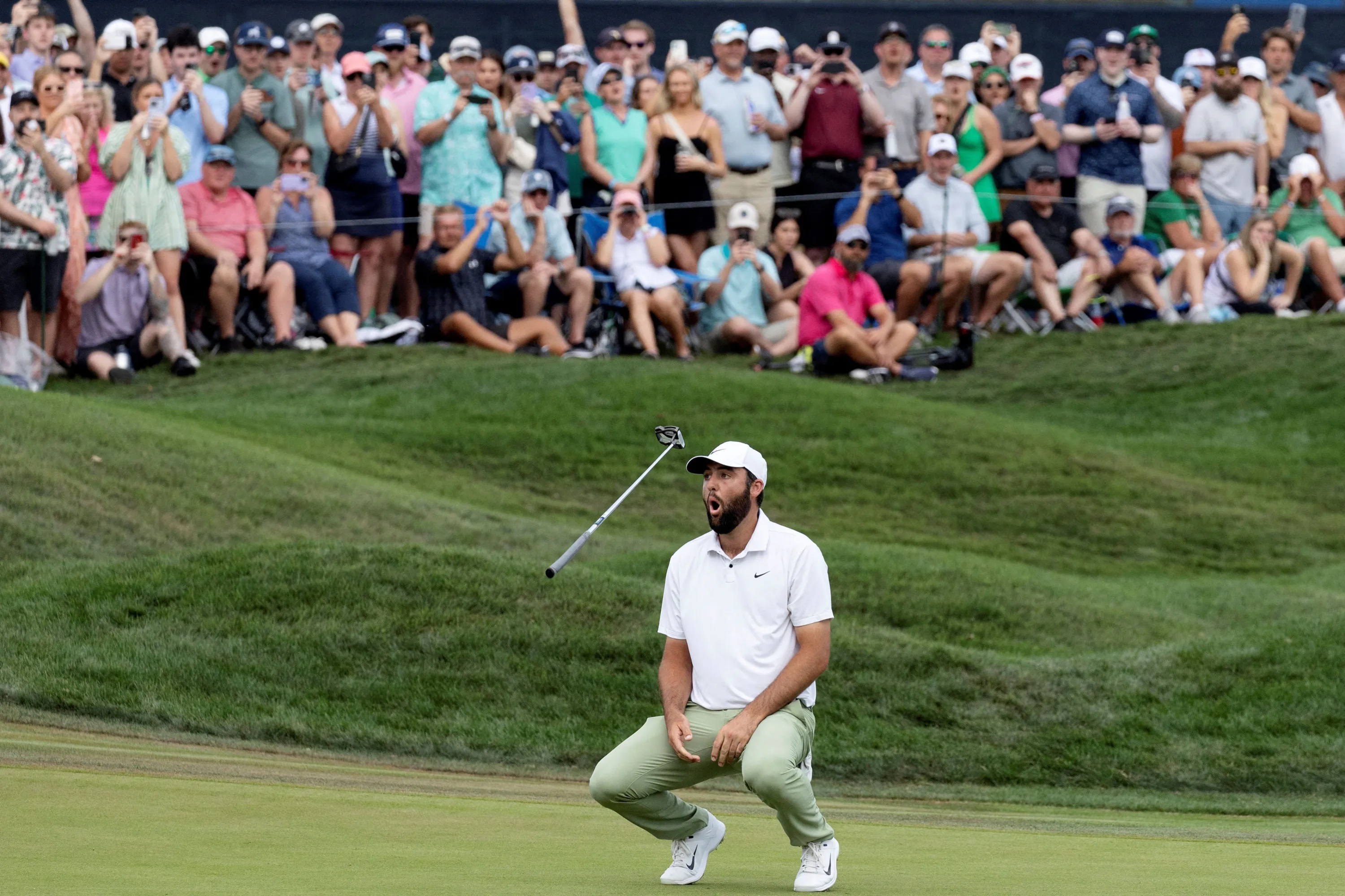 Scottie Scheffler reacts to a missed putt on the 18th green during the final round of THE PLAYERS Championship golf tournament in Ponte Vedra Beach, Florida on March 17, 2024. (Photo by David Yeazell/USA TODAY Sports)