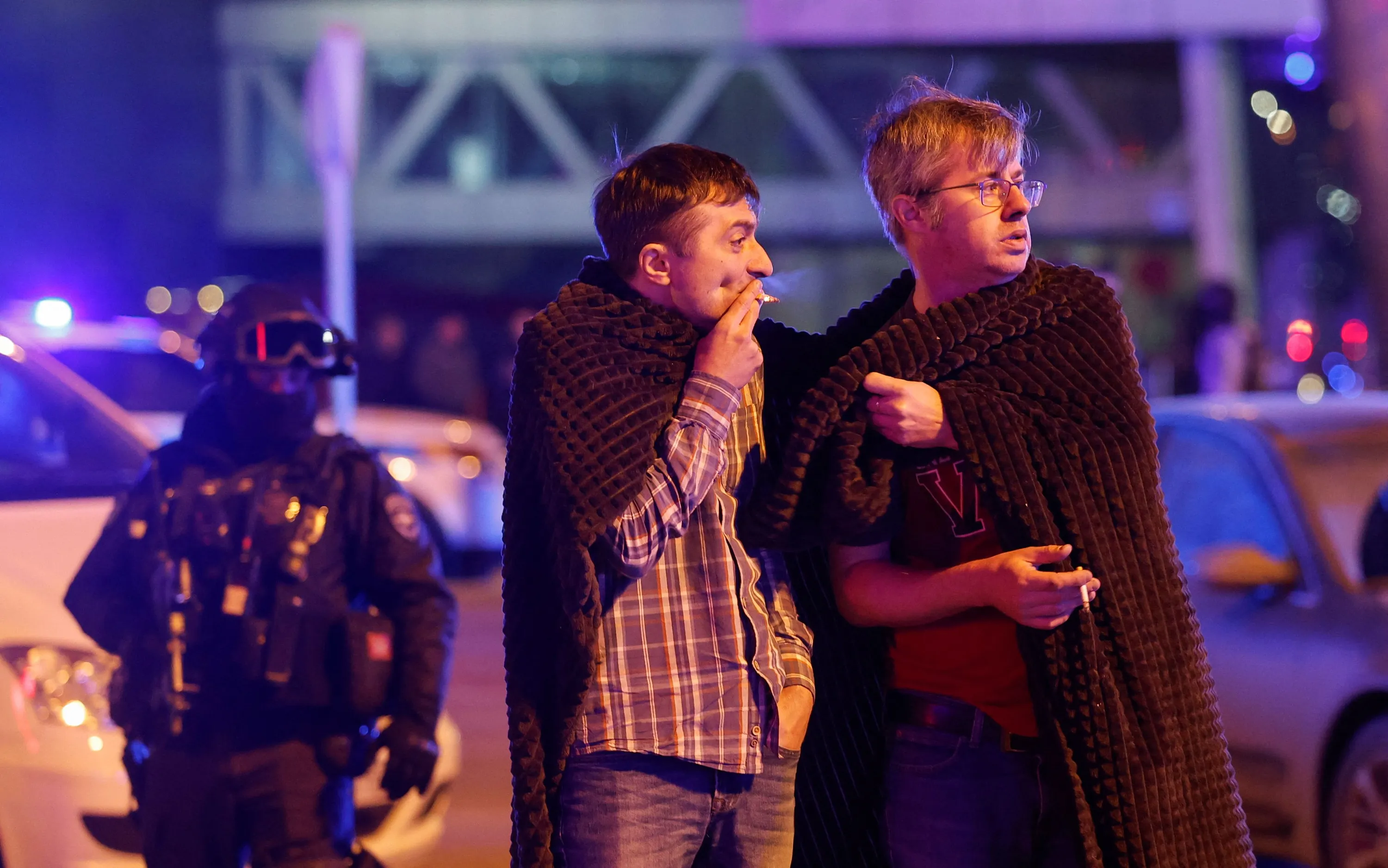 Men cover themselves with blankets as a Russian law enforcement officer stands guard near the burning Crocus City Hall concert venue following a shooting incident, outside Moscow, Russia, on March 22, 2024. (Photo by Maxim Shemetov/Reuters)