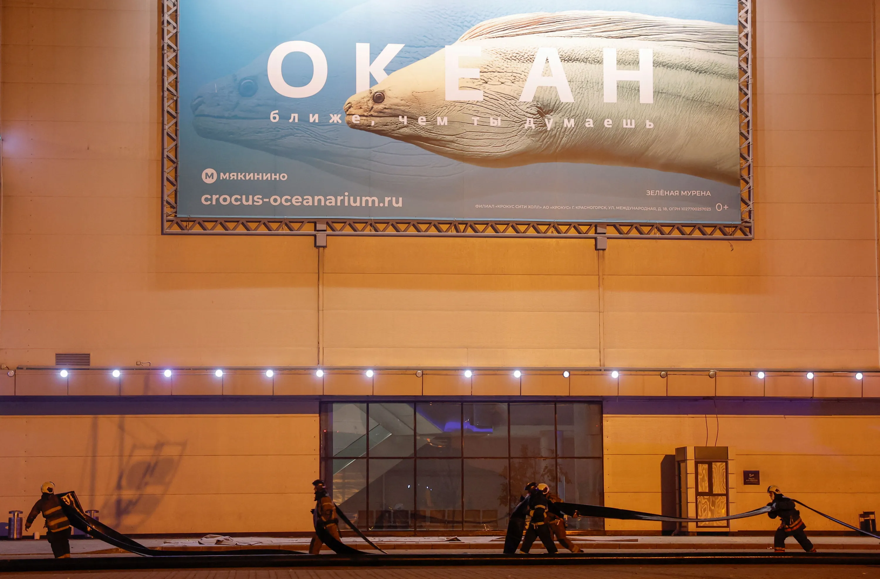 Firefighters walk under an advertising board of an oceanarium near the Crocus City Hall concert venue outside Moscow, Russia, on March 22, 2024. (Photo by Maxim Shemetov/Reuters)