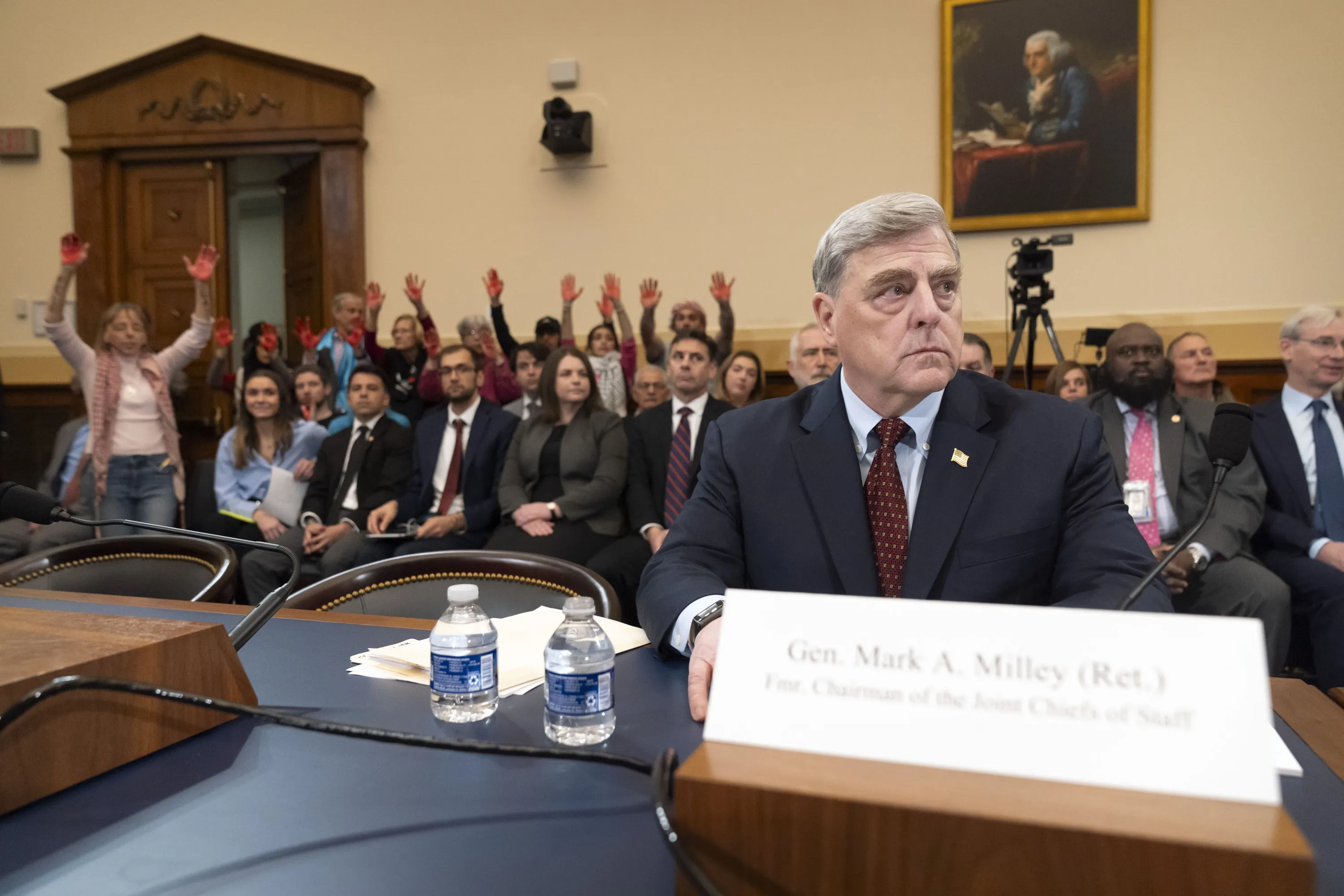 Demonstrators from Code Pink stand with red-colored hands as retired Gen. Mark Milley, the former chairman of the Joint Chiefs of Staff, waits to appear before the House Foreign Affairs Committee about the U.S. withdrawal from Afghanistan on Capitol Hill, Tuesday, March 19, 2024, in Washington. (Photo by Mark Schiefelbein/AP Photo)