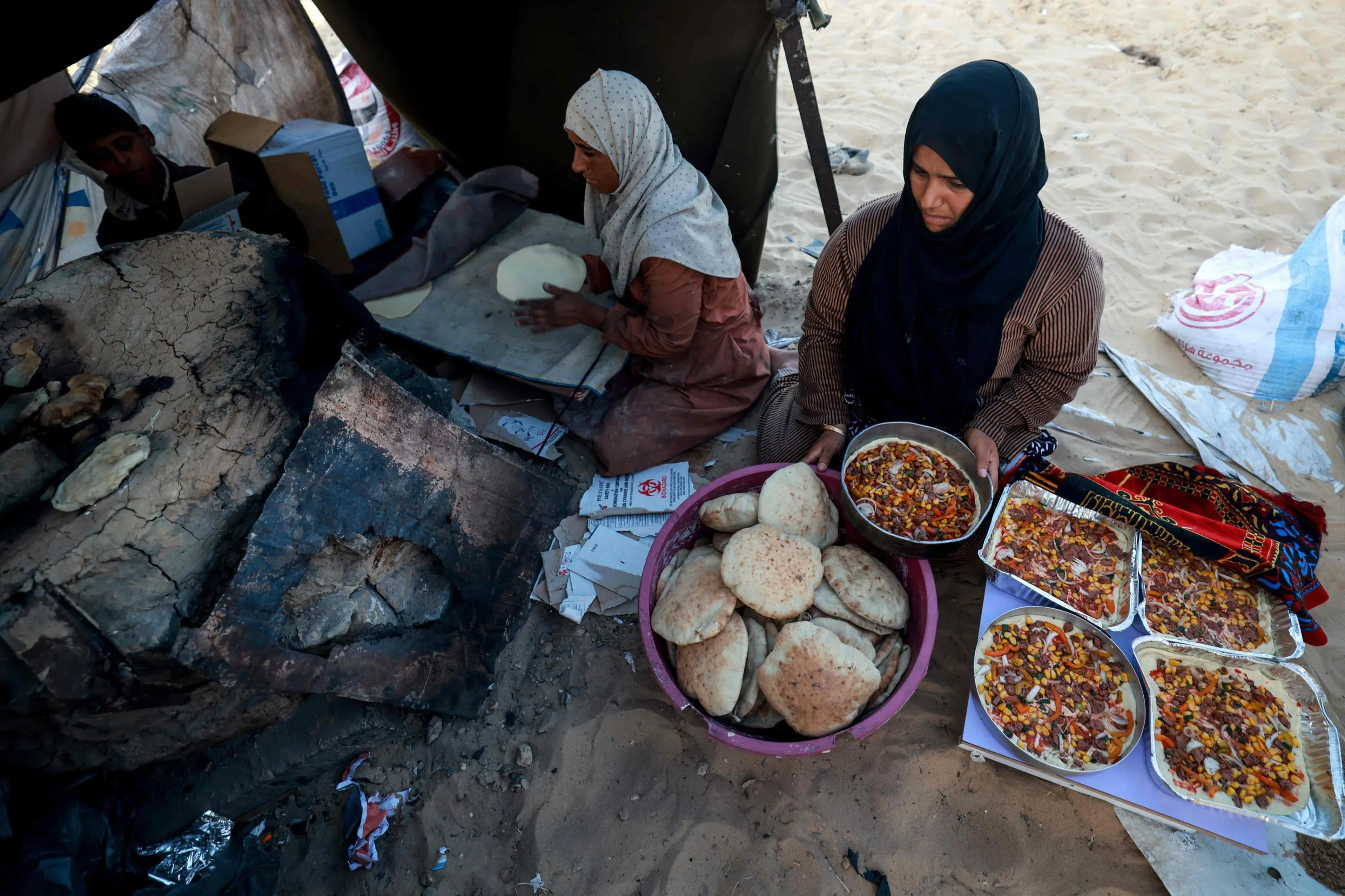 Displaced Palestinians prepare bread for an iftar meal, the breaking of fast, on the first day of the Muslim holy fasting month of Ramadan, inside a tent in Rafah in the southern Gaza Strip on March 11, 2024, amid ongoing battles between Israel and the militant group Hamas. (Photo by Mohammed Abed/AFP Photo)