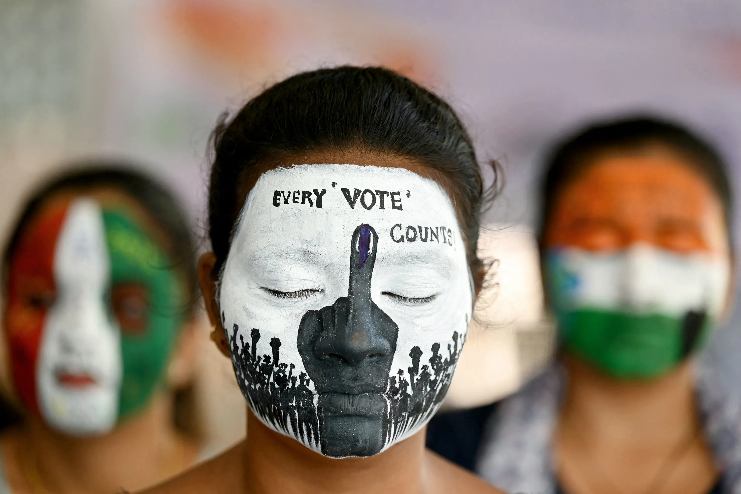 College students with painted faces spread awareness for first generation voters during an election campaign ahead of India's upcoming national elections in Chennai on March 19, 2024. (Photo by R Satish Babu/AFP Photo)