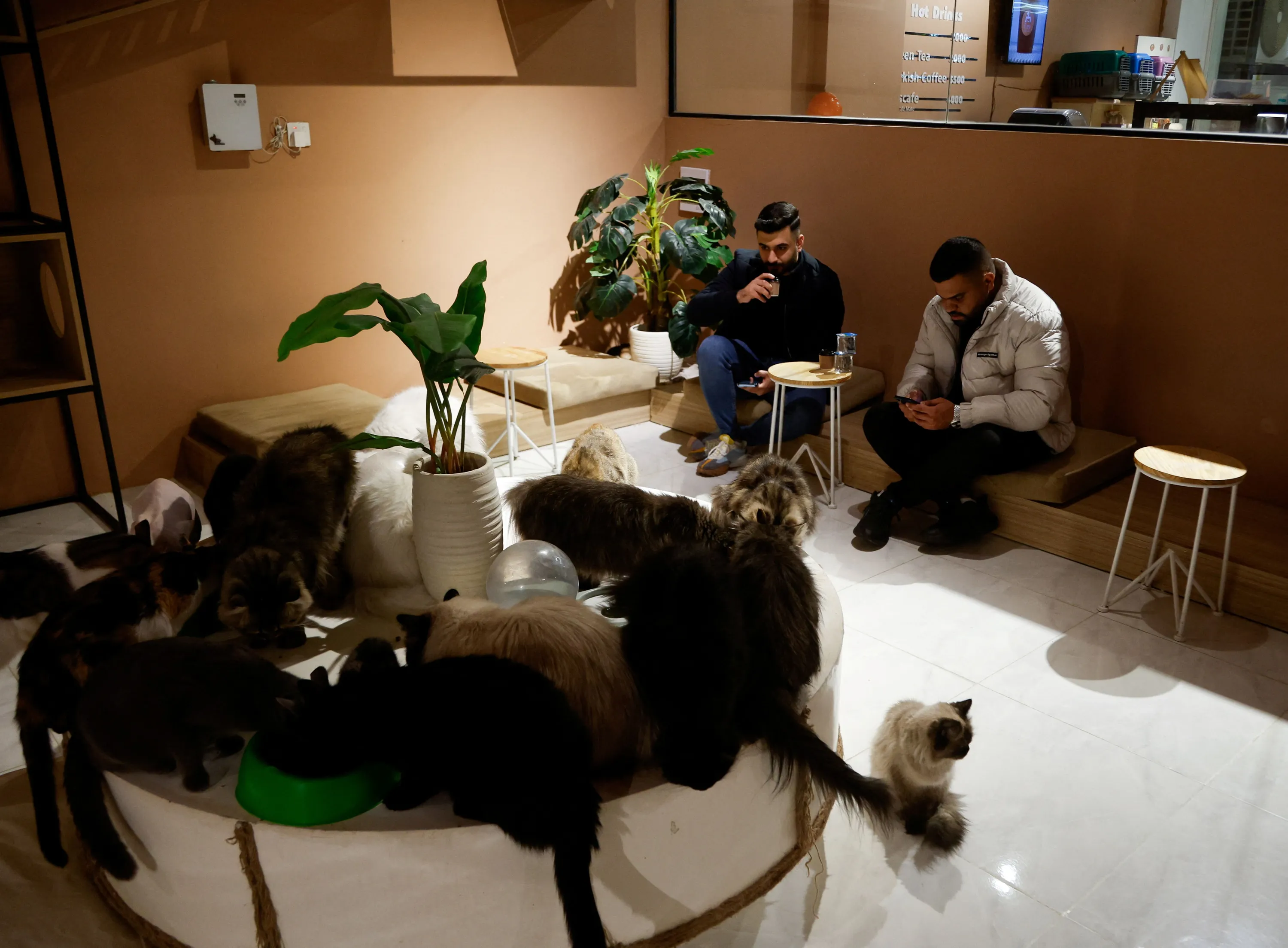 Men sit in a special cafe with cats, which is the first of this kind in the city of Erbil, that allows customers to play with cats, and helps to raise and not harm them, in Erbil, Iraq, on February 26, 2024. (Photo by Khalid Al-Mousily/Reuters)