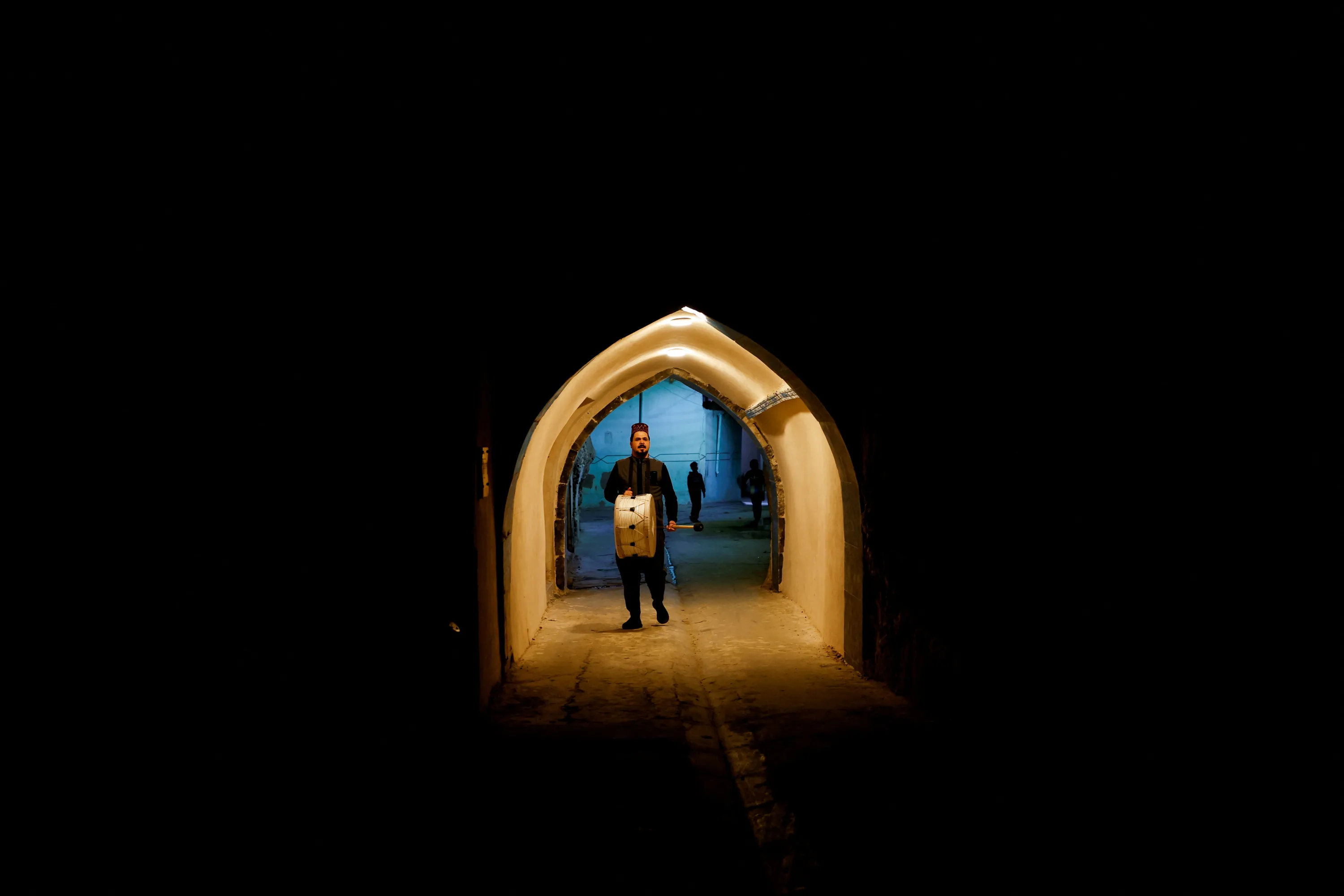 Mesaharty Ghofran Thamer, 32, carrying a drum, walks around the streets of the old city of Mosul at night to wake up Muslims to eat their meal before the beginning of the day's fast and the morning prayers during Ramadan, in Mosul, Iraq on March 15, 2024. (Photo by Khalid Al-Mousily/Reuters)