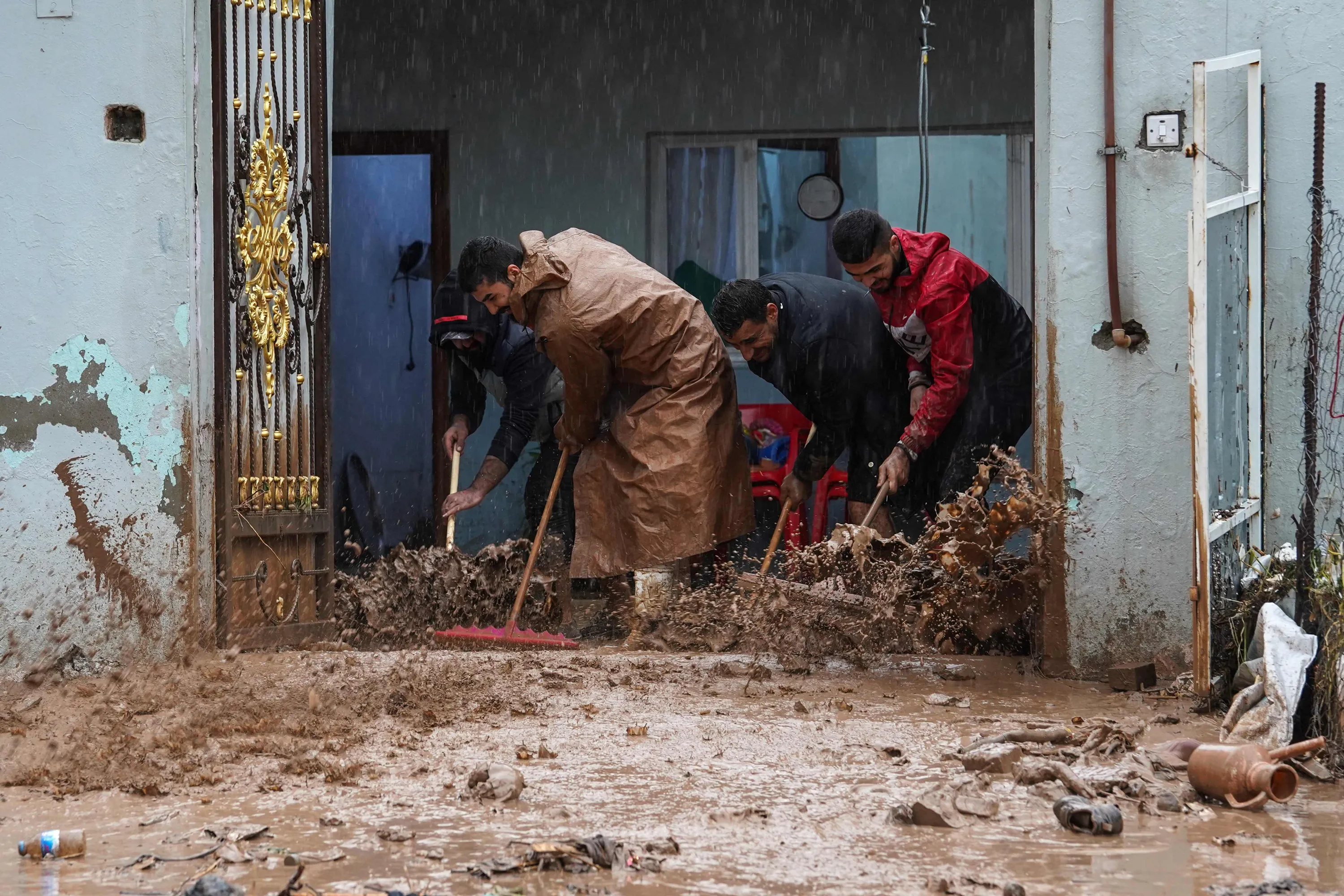 Iraqi men clean up muddy water following heavy rains in Dohuk in Iraq's northern autonomous Kurdistan region on March 19, 2024. (Photo by Ismael Adnan/AFP Photo)