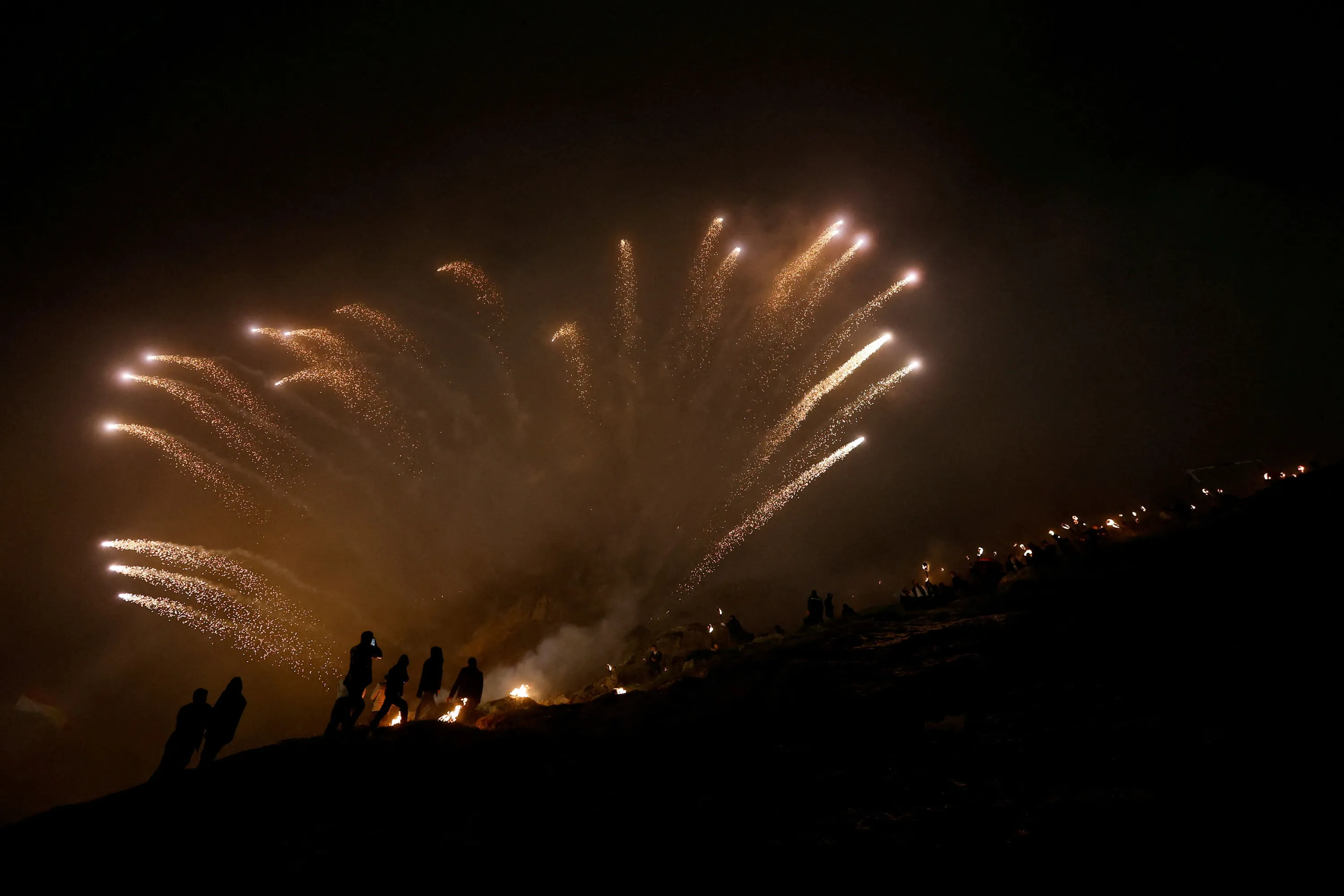 Fireworks light the sky as Iraqi Kurds carry fire torches during the celebration of Nowruz Day, a festival marking the first day of spring and Persian New Year, in Akra, Iraq on March 20, 2024. (Photo by Khalid Al-Mousily/Reuters)