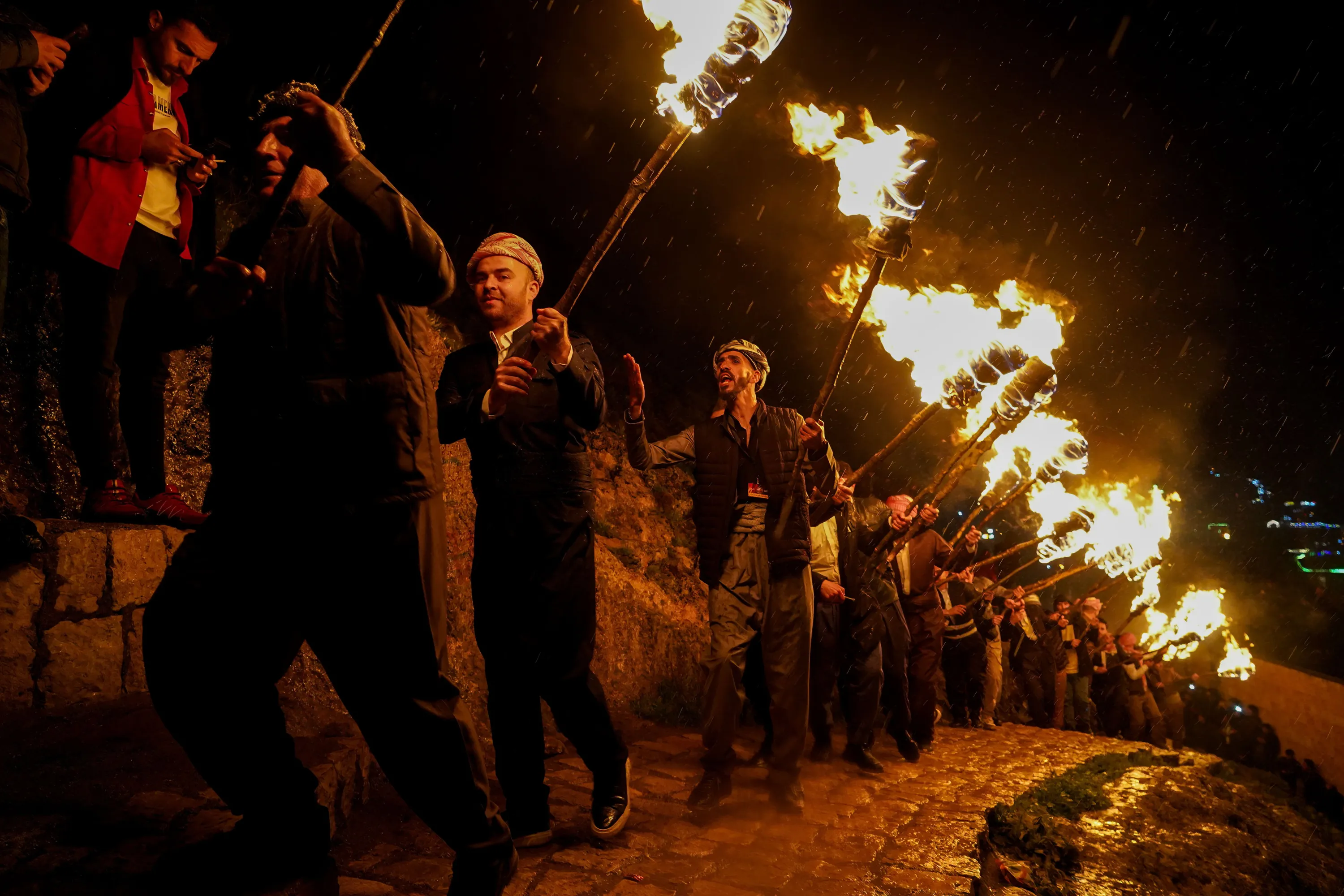 Iraqi Kurds carry fire torches as they celebrate Nowruz Day, a festival marking the first day of spring, Kurdish and Persian New Year in Akre, Iraq on March 20, 2024. Newroz or Nowruz means “new day” in Persian, and is celebrated to mark the arrival of spring and the first day of the Iranian calendar. It is widely celebrated in Persian and neighboring regions and is recognized on UNESCO's Intangible Cultural Heritage of Human List. (Photo by Ismael Adnan/SOPA Images/Rex Features/Shutterstock)