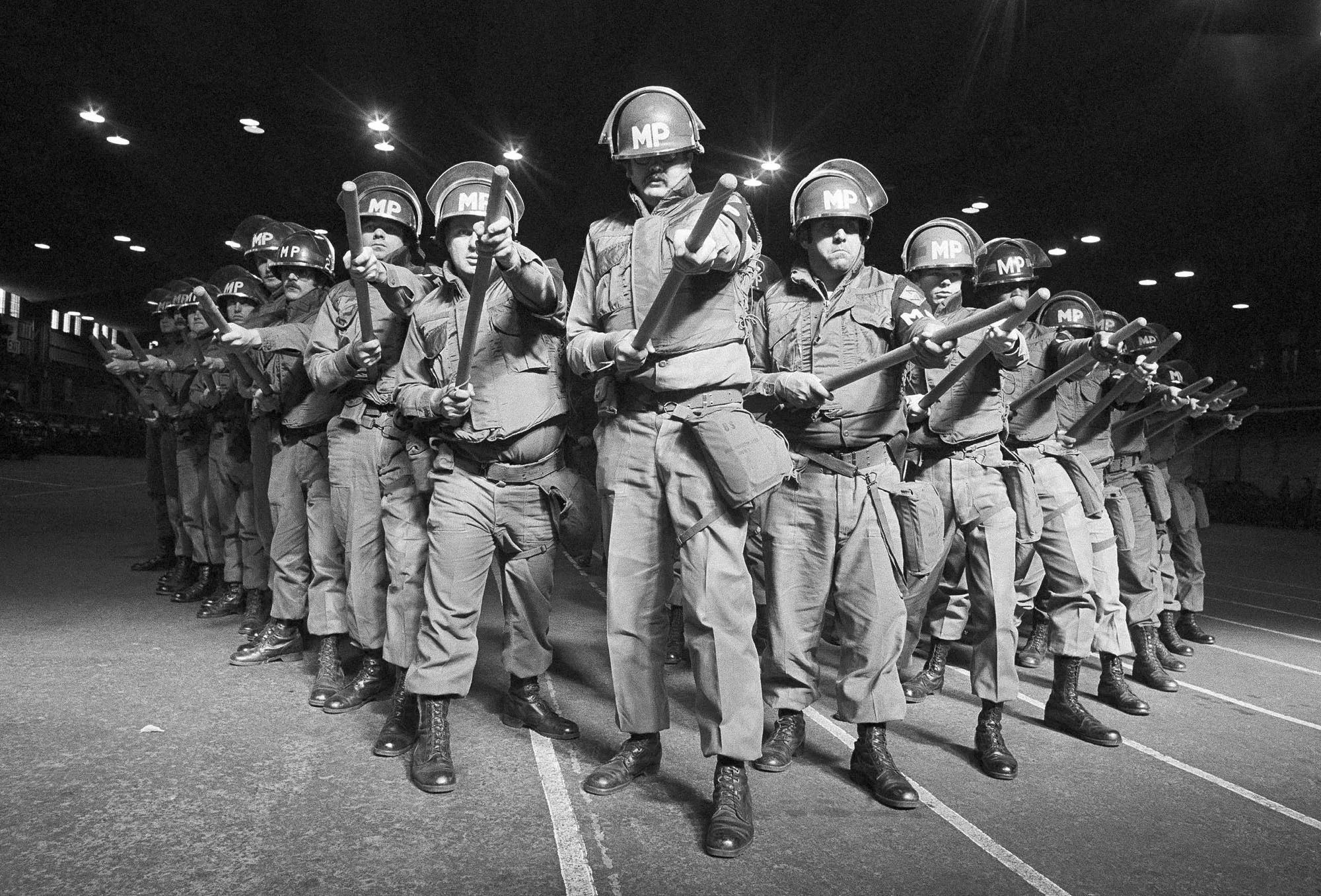 National Guardsmen are put through riot training in Boston's Commonwealth Armory on Friday, October 18, 1974. Massachusetts Gov. Francis W. Sargent called up the guard to quell school violence, but the city has been relatively calm and the guard has remained in the armories. (Photo by JWG/AP Photo)