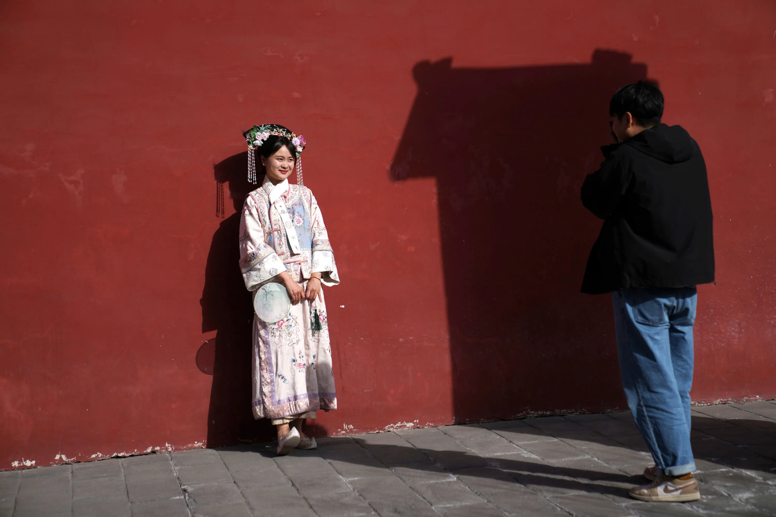 A visitor dressed in a period costume poses for photo at the Forbidden City in Beijing, China, Saturday, March 16, 2024. (Photo by Tatan Syuflana/AP Photo)