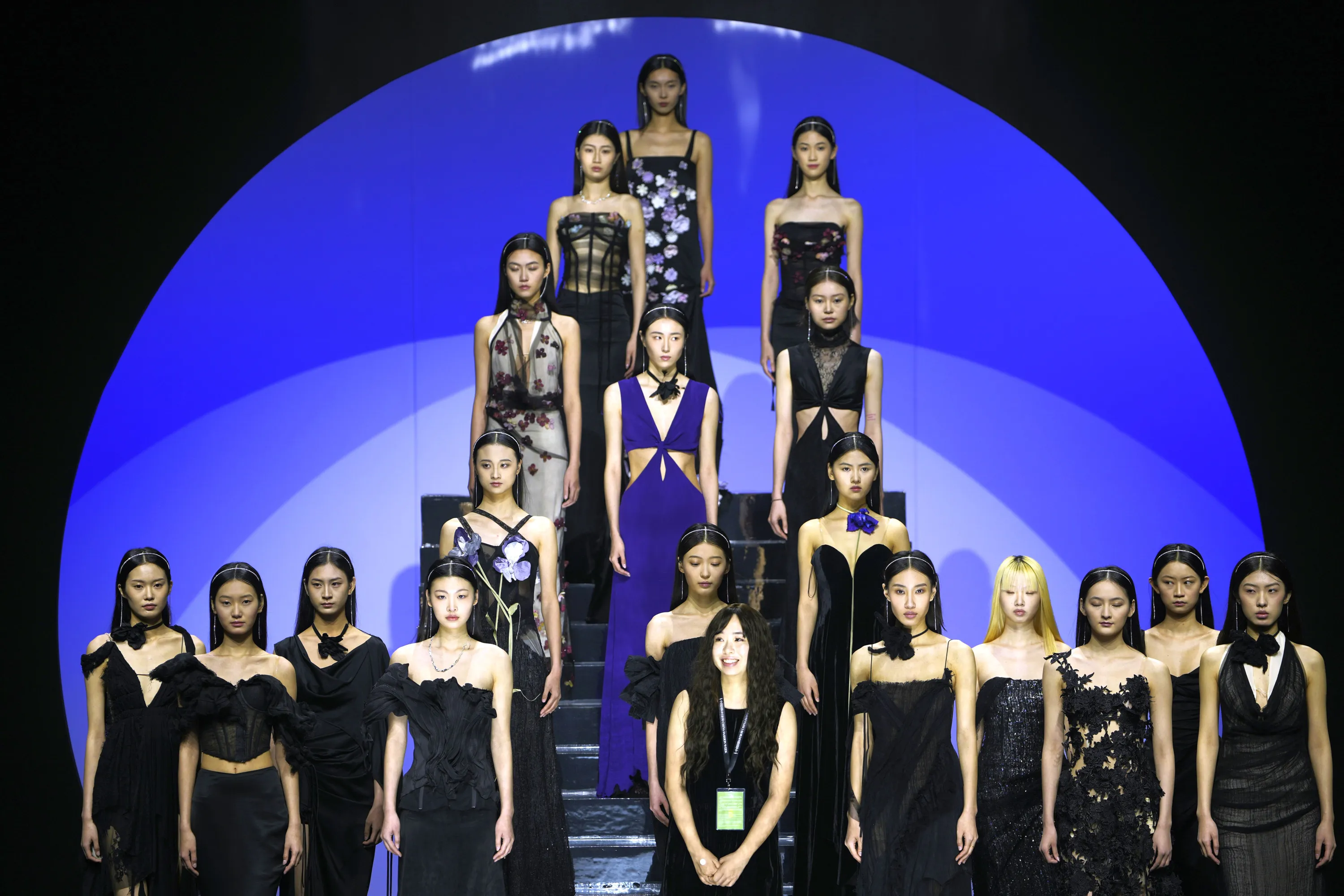 Designer Xiangqiao Sheng, center, poses with models wearing her latest fashion during China Fashion Week in Beijing, Monday, March 25, 2024. (Photo by Ng Han Guan/AP Photo)