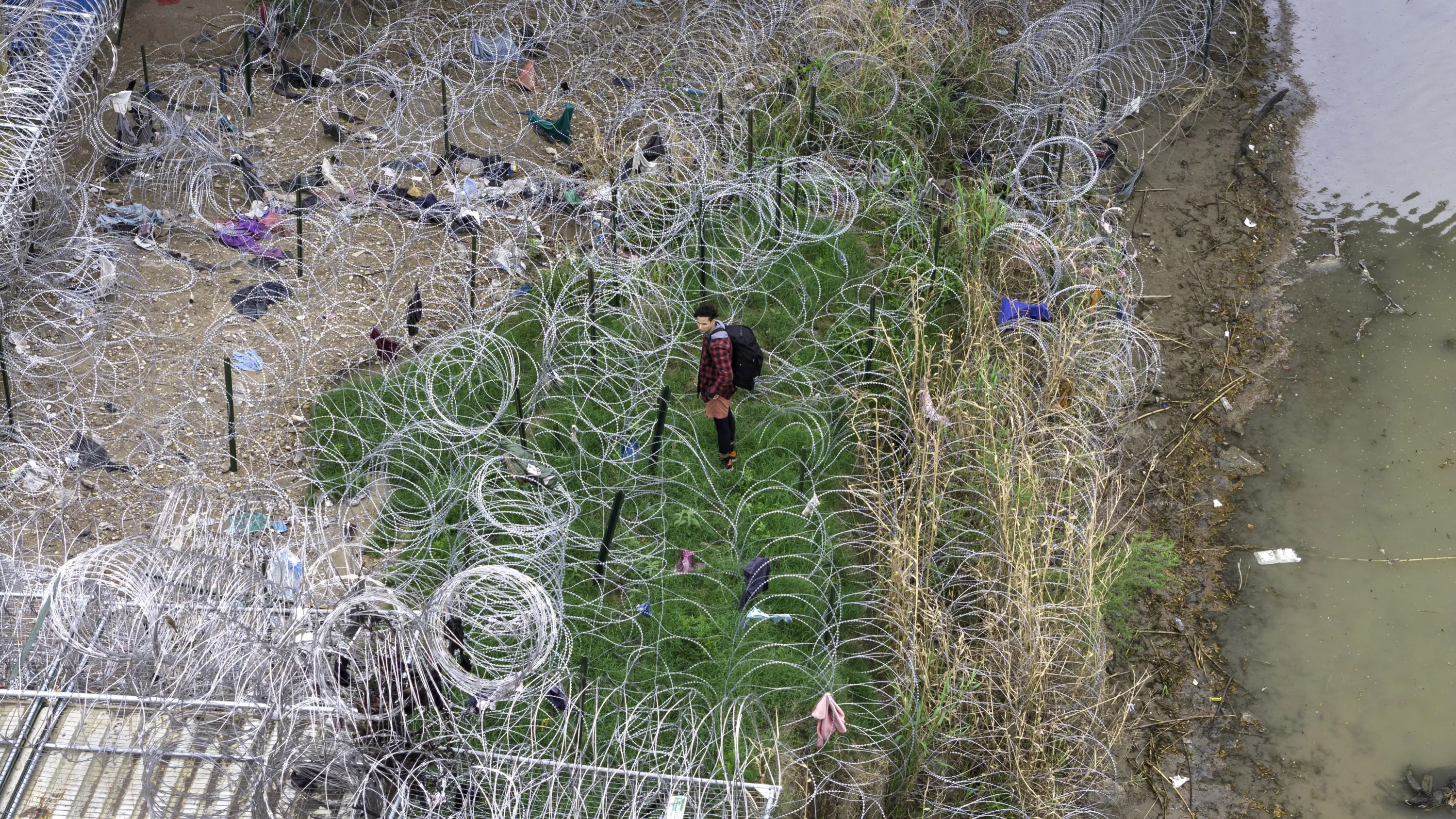 In an aerial view, an immigrant faces coils of razor wire after crossing the Rio Grande from Mexico on March 17, 2024 in Eagle Pass, Texas. Texas National Guard troops have fortified Eagle Pass with vast a amount of razor wire as part of Governor Greg Abbott's “Operation Lone Star” to deter migrants from crossing into Texas. The U.S. southwestern border stretches nearly 2,000 miles, from the Gulf of Mexico to the Pacific Ocean and is marked by fences, deserts, mountains and the Rio Grande, which runs the entire length of Texas. The politics surrounding border and immigration issues have become dominant themes in the U.S. presidential election campaign. (Photo by John Moore/Getty Images)