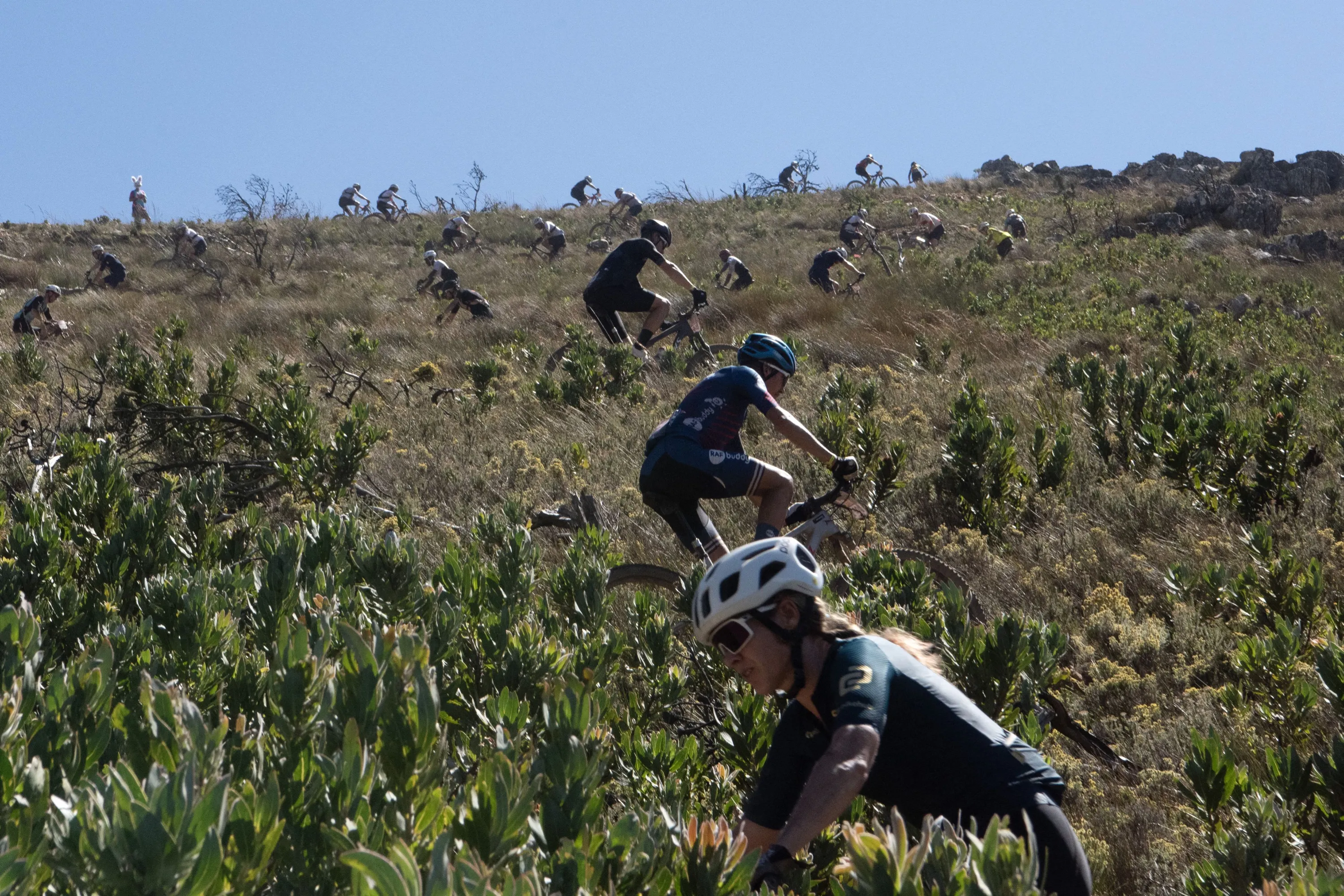 Competitors ride during Stage 4 of the 2024 Cape Epic mountain bike race on March 21, 2024 in the mountains above the town of Wellington. In this stage the competitors race over a distance of 75km, and climb 2500m in height. The Cape Epic, now in it's twentieth edition, in which two riders race as a team, is widely known as the foremost mountain bike stage race in the world, with some of the best riders in the world covering a distance of approximately 617 kilometres, and gaining over 16500m in height, over eight days of racing. This race is classified “hors categorie” by the Union Cycliste Internationale (UCI), making it an important race in the racing professionals calendar. (Photo by Rodger Bosch/AFP Photo)