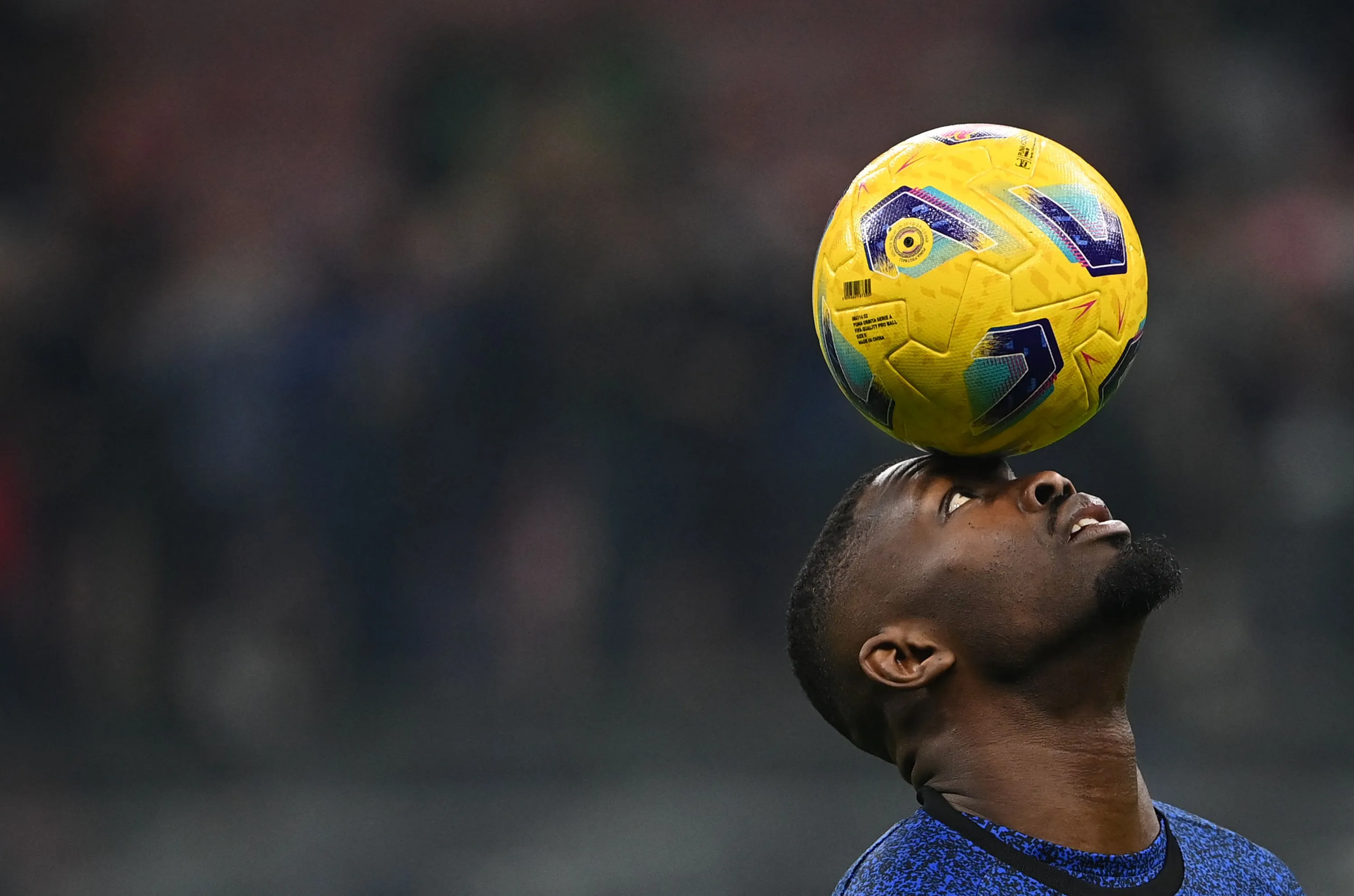 Inter Milan's French forward #9 Marcus Thuram warms up prior to the Italian Serie A football match between Inter Milan and SSC Napoli, at San Siro Stadium, in Milan, on March 17, 2024. (Photo by Isabella Bonotto/AFP Photo)