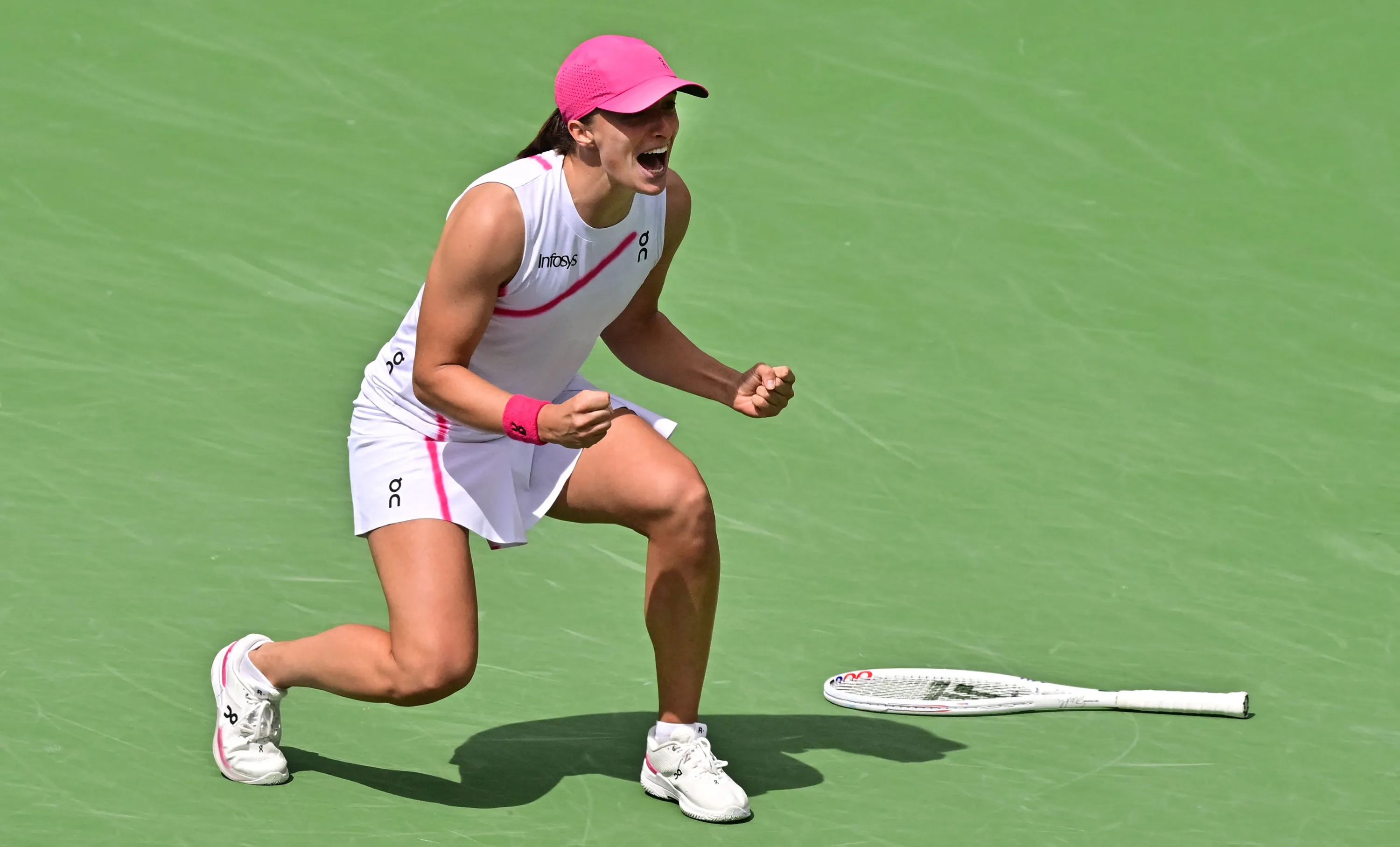 Poland's Iga Swiatek reacts after winning match point against Greece's Maria Sakkari during the ATP-WTA Indian Wells Masters women's final tennis match at the Indian Wells Tennis Garden in Indian Wells, California, on March 17, 2024. World number one Iga Swiatek powered past Greece's Maria Sakkari 6-4, 6-0 on March 17, 2024 to claim her second Indian Wells WTA title two years after she beat Sakkari for her first. (Photo by Frederic J. Brown/AFP Photo)