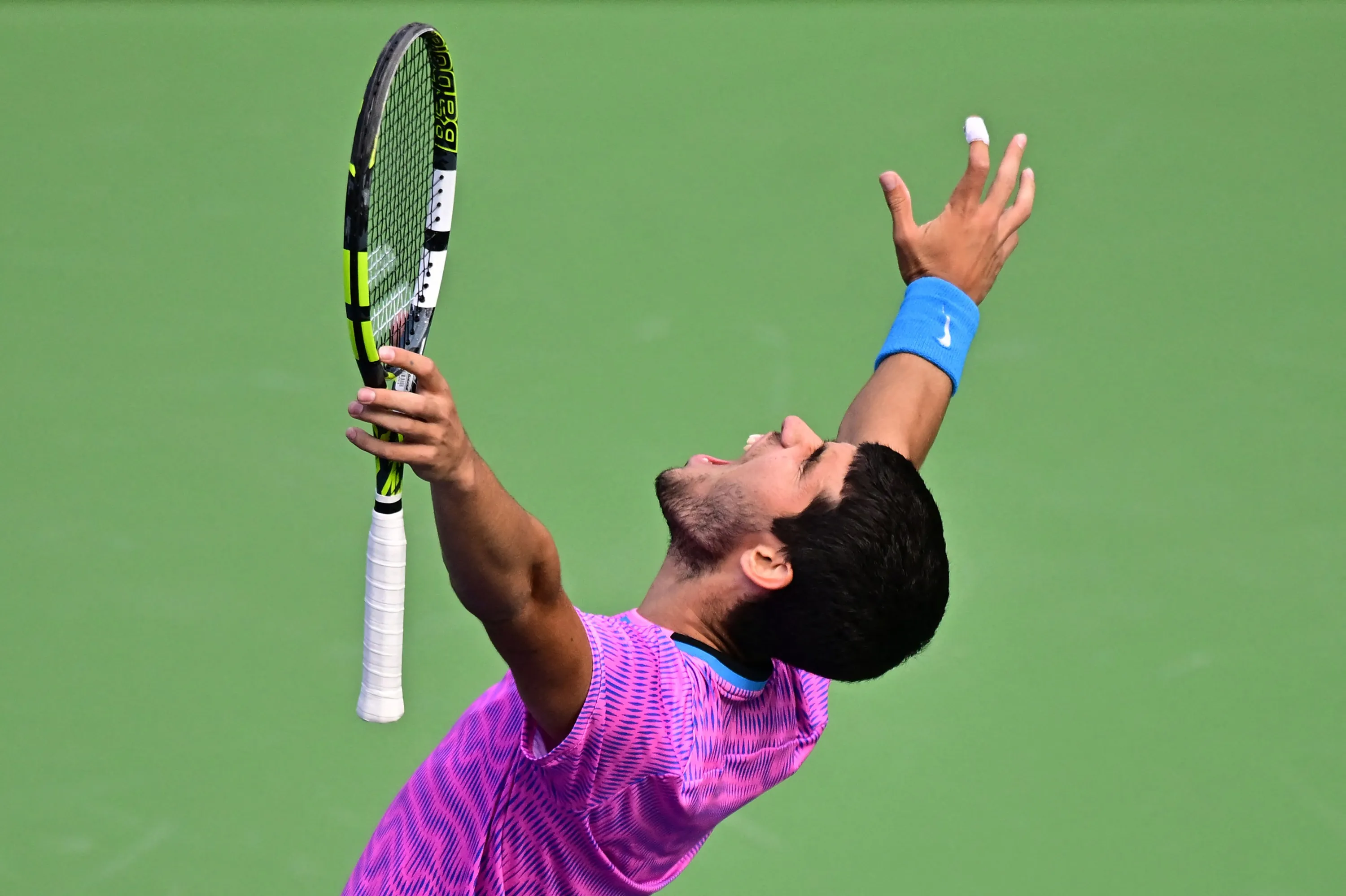Spain's Carlos Alcaraz reacts after winning match point against Russia's Daniil Medvedev in the ATP-WTA Indian Wells Masters men's final tennis match at the Indian Wells Tennis Garden in Indian Wells, California, on March 17, 2024. (Photo by Frederic J. Brown/AFP Photo)