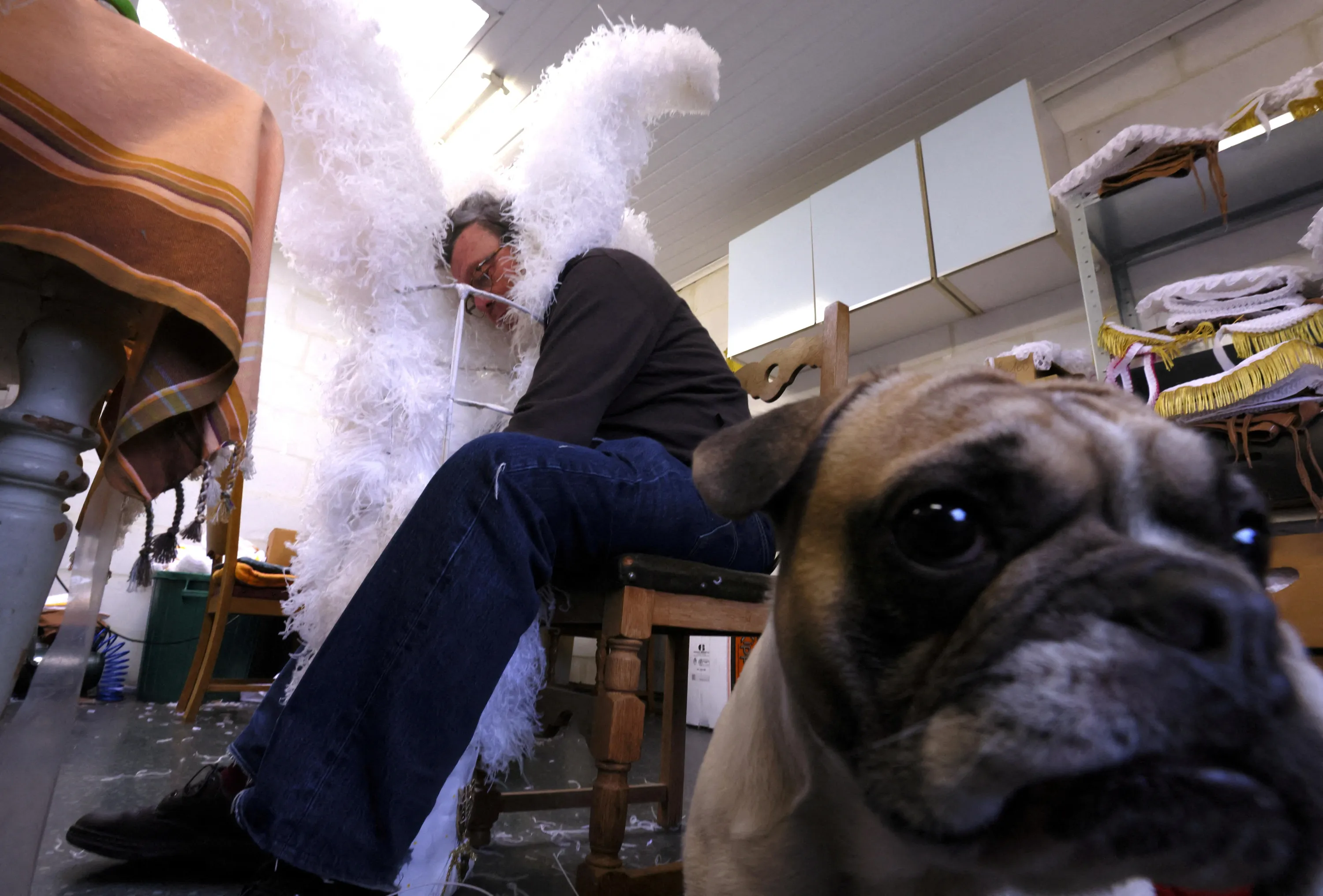 Louis Kersten, 82, artisan and renter of costumes for “Gilles of Binche” adjusts an ostrich feather hat in his workshop that will be worn by a performer during the Binche carnival, a UNESCO World Heritage event, in Binche, Belgium on January 24, 2023. (Photo by Yves Herman/Reuters)