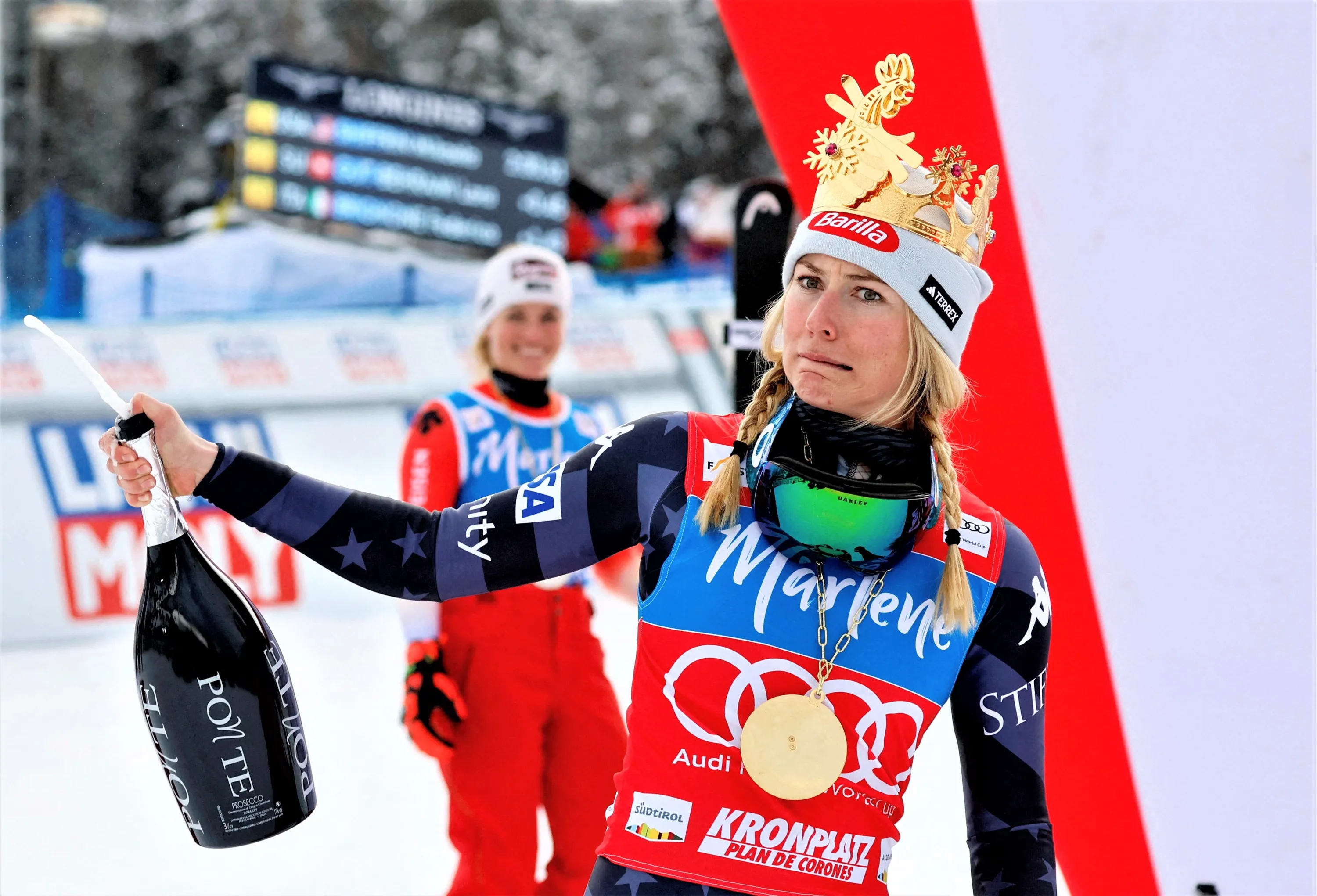 USA's Mikaela Shiffrin celebrates on the podium after winning the Women's Giant Slalom as part of the FIS Alpine World Ski Championships in Kronplatz (Plan de Corones), Dolomites Mountains, on January 25, 2023. (Photo by Lisa Leutner/Reuters)