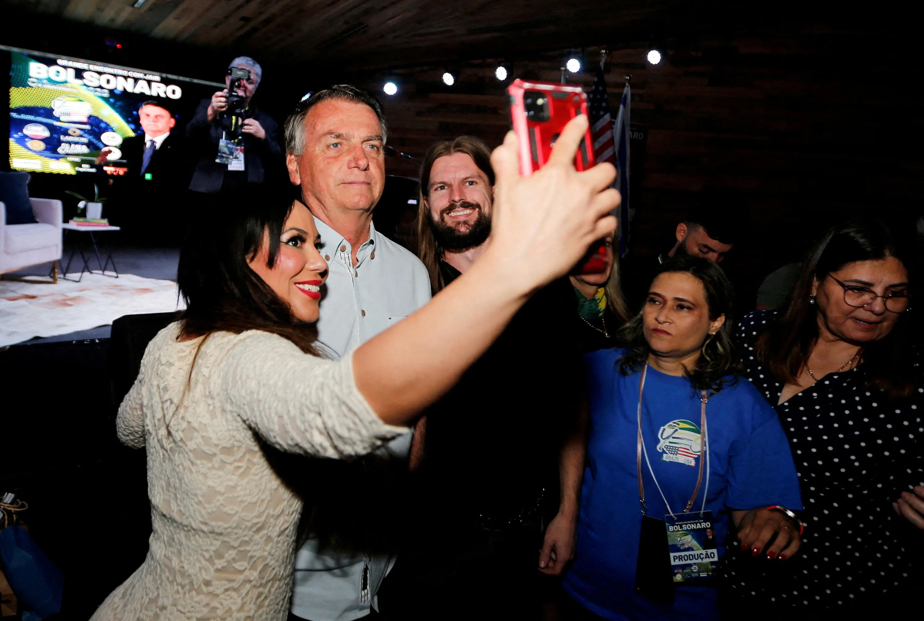 Former Brazilian President Jair Bolsonaro poses for a selfie during an event taking place in a restaurant at Dezerland amusement park in Orlando, Florida, U.S. January 31, 2023. (Photo by Joe Skipper/Reuters)