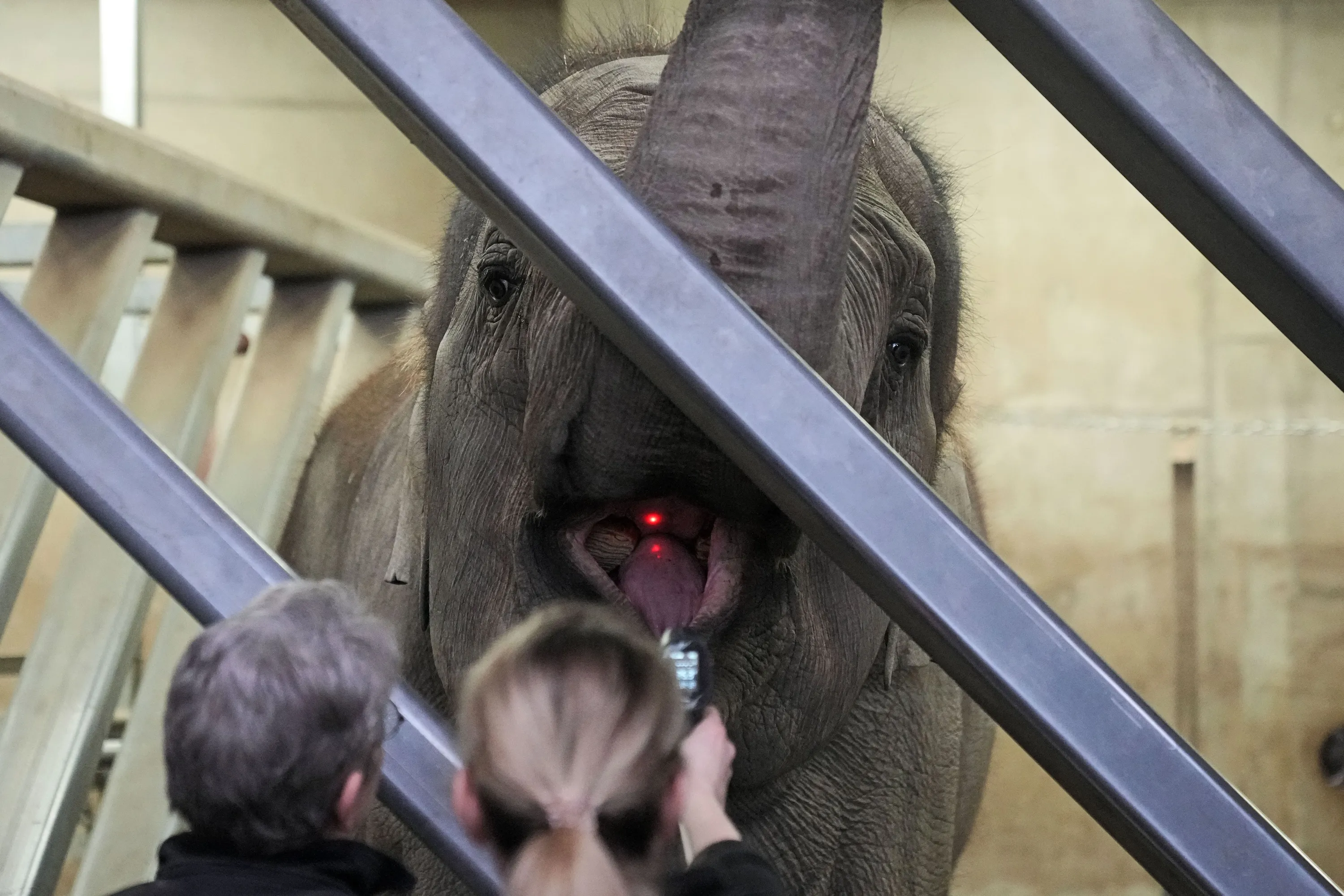 Zookeepers measure the temperature of an elephant during a daily medical check at the zoo in Cologne, Germany, Thursday, March 21, 2024. (Photo by Martin Meissner/AP Photo)