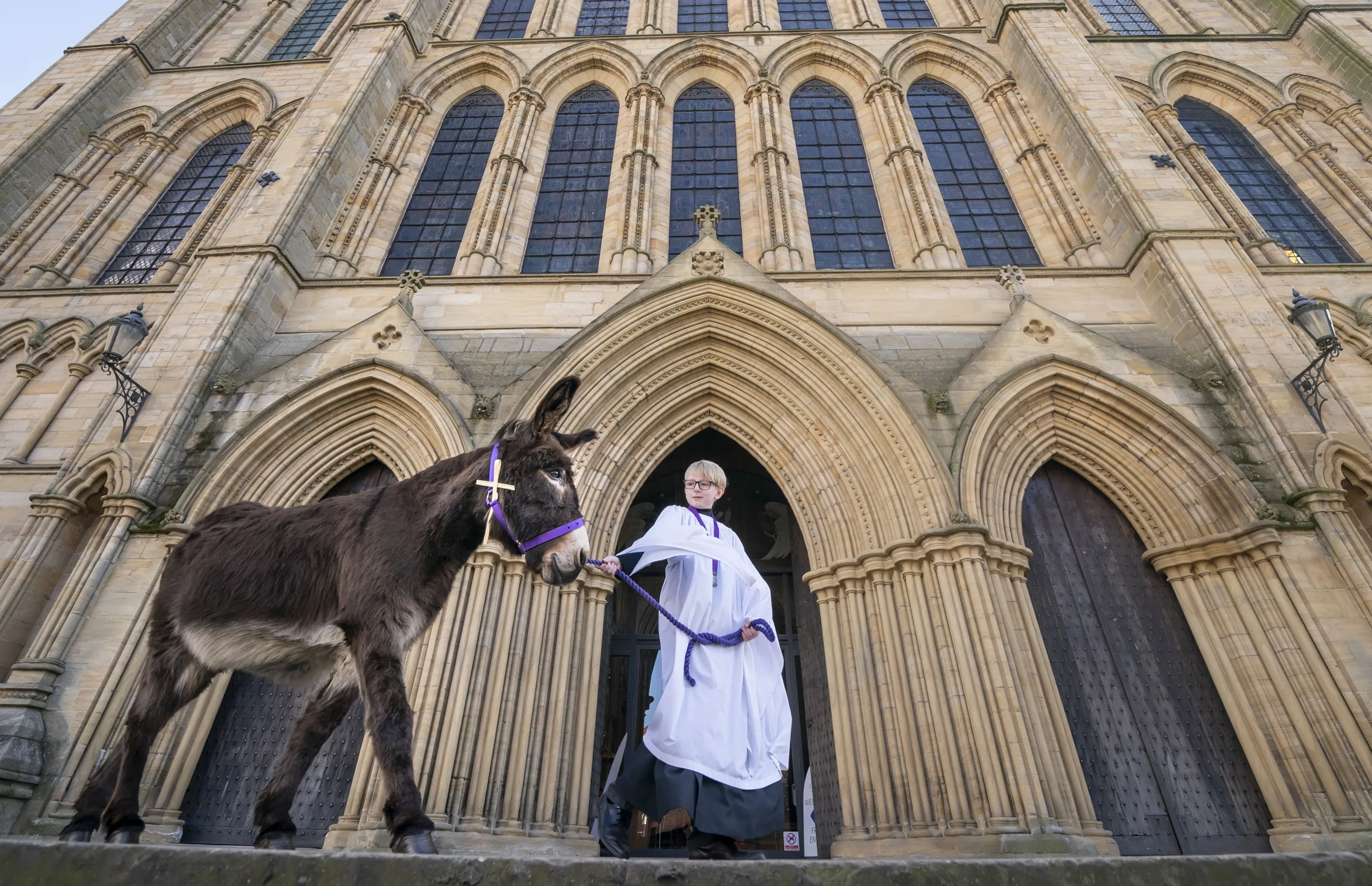 Xander Galloway-Gee leads a donkey during a photocall following the Palm Sunday Eucharist Service at Ripon Cathedral in North Yorkshire on Sunday, March 24, 2024. (Photo by Danny Lawson/PA Images via Getty Images)