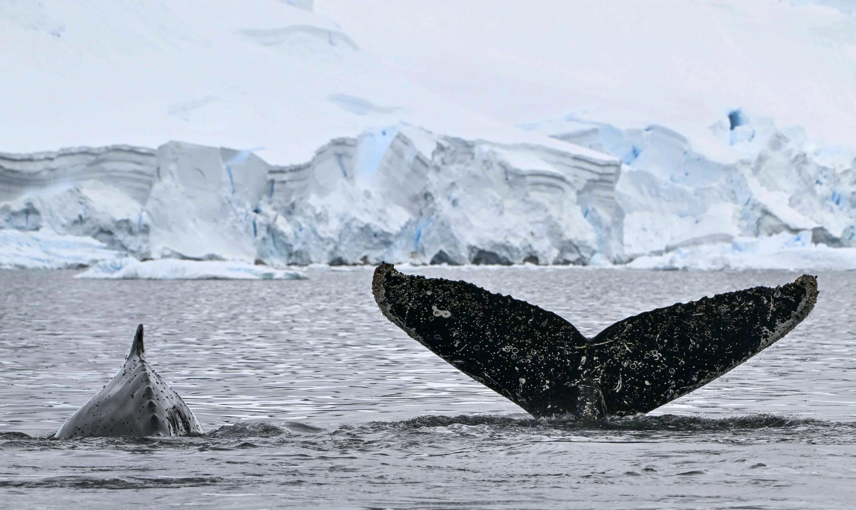 View of the tail of a Humpback whale at the Gerlache Strait, which separates the Palmer Archipelago from the Antarctic Peninsula, in Antarctica on January 19, 2024. A team of scientists have been working since 2014 on the elaboration of a catalog based on the visual analysis of cetacean tails, both in the confines of the continent and in the Colombian Pacific. (Photo by Juan Barreto/AFP Photo)