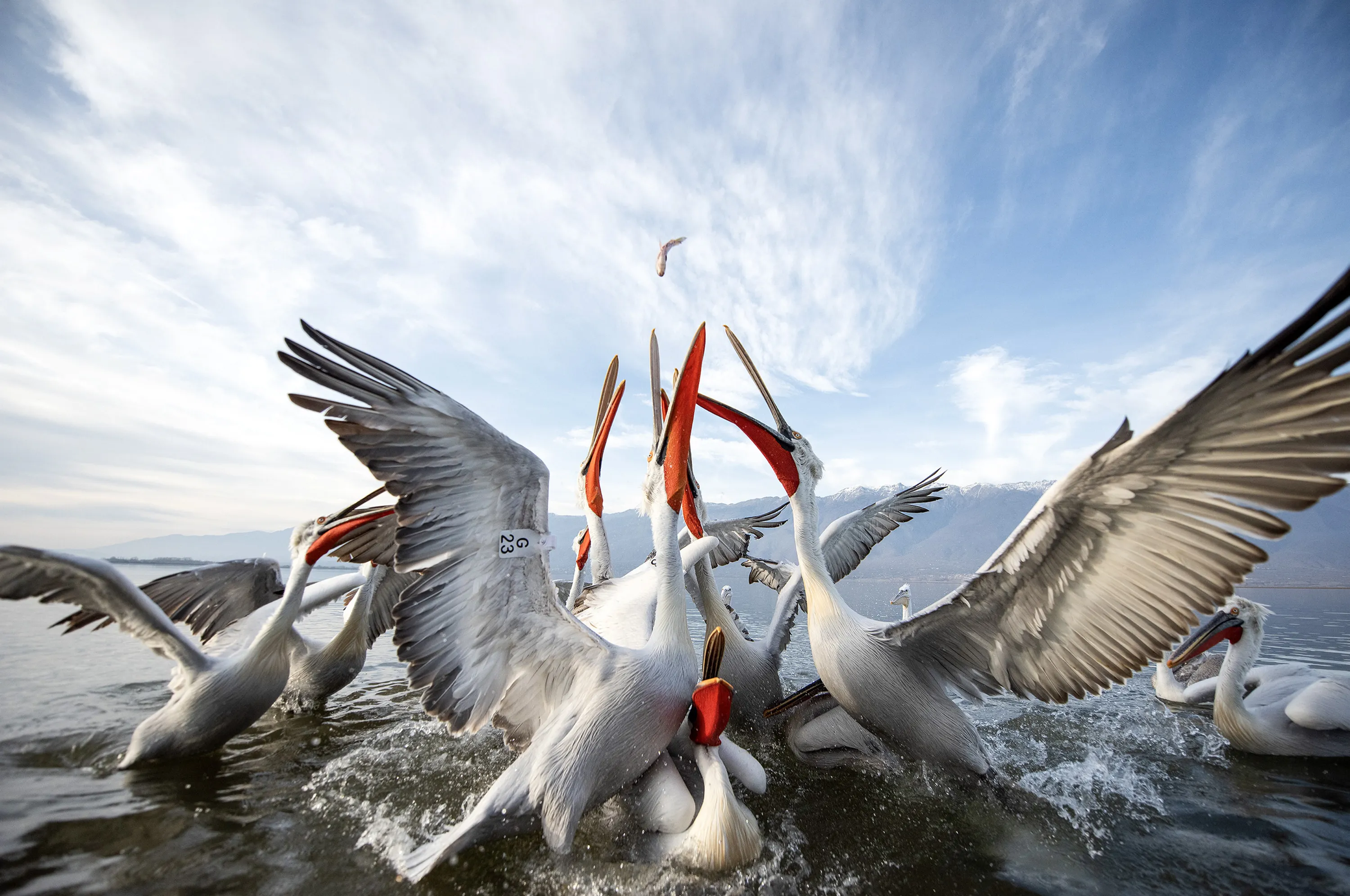 A pod of pelicans squabble over fish at Lake Kerkini, northern Greece, March 2023. (Photo by Dimo Hristev/Solent News)