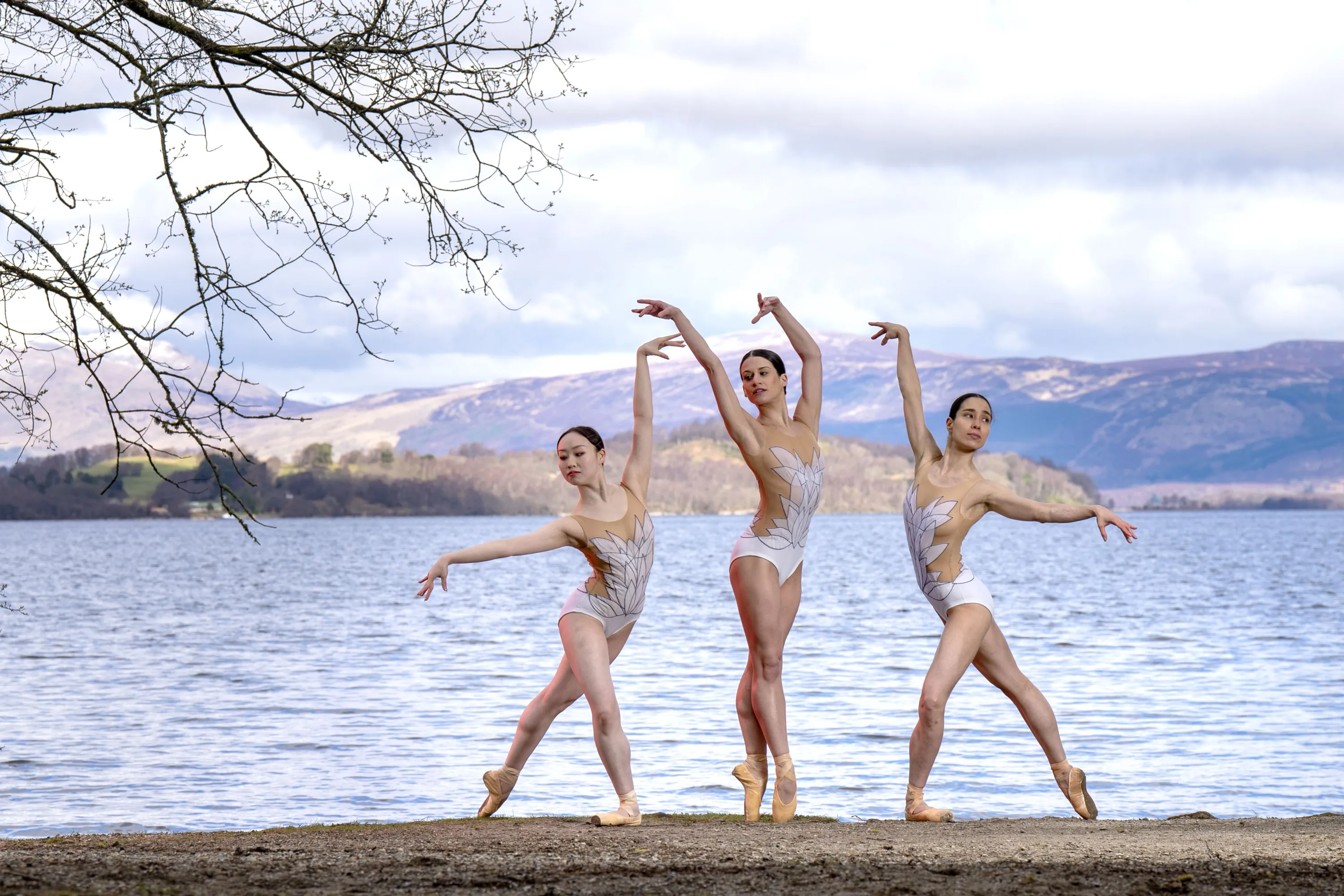 Scottish Ballet dancers (left to right) Urara Takata, Danila Marzilli and Seira Winning dance on the banks of Loch Lomond on Tuesday, March 26, 2024 ahead of the Swan Lake tour, which opens in Glasgow next week then tours to Aberdeen, Inverness and Edinburgh. (Photo by Jane Barlow/PA Images via Getty Images)