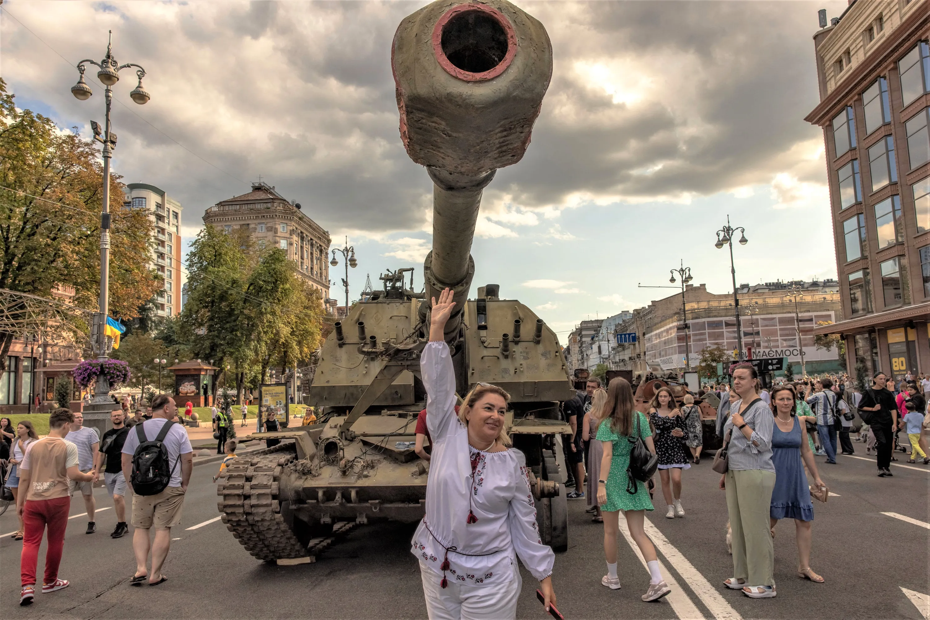 A woman wearing traditional Ukrainian clothes poses for photographs in front of a destroyed Russian armored military vehicle displayed in main street Khreshchatyk Street on Ukraine's Independence Day in Kyiv, on August 24, 2023, amid the Russian invasion of Ukraine. (Photo by Roman Pilipey/AFP Photo)