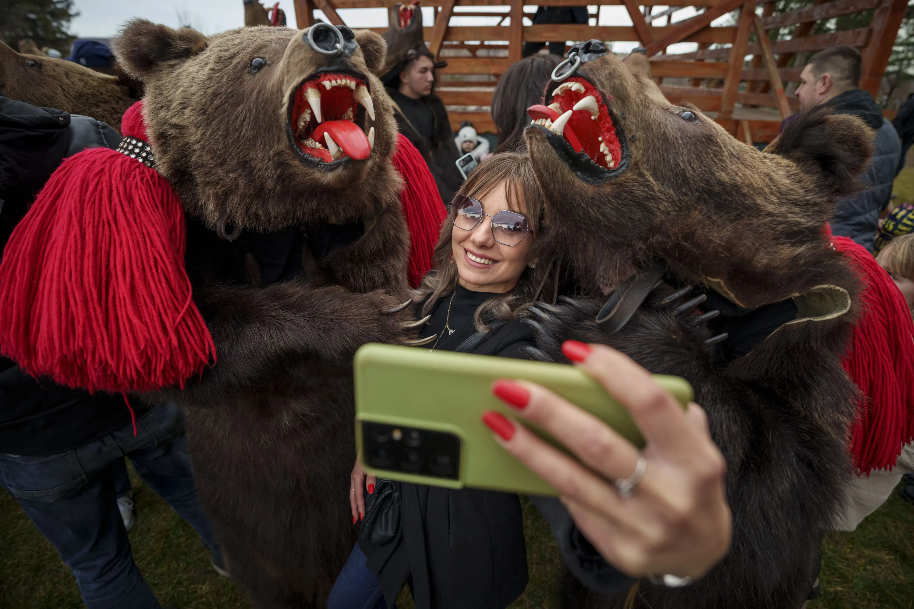 A woman takes a selfie picture with members of the Sipoteni bear pack after watching their performance in Racova, northern Romania, Tuesday, December 26, 2023. Centuries ago, people in what is now northeastern Romania would don bear fur and dance to fend off evil spirits. Nowadays, the unique custom thrives, with popular festivals drawing large crowds of locals and tourists. (Photo by Andreea AlexandruAP Photo)