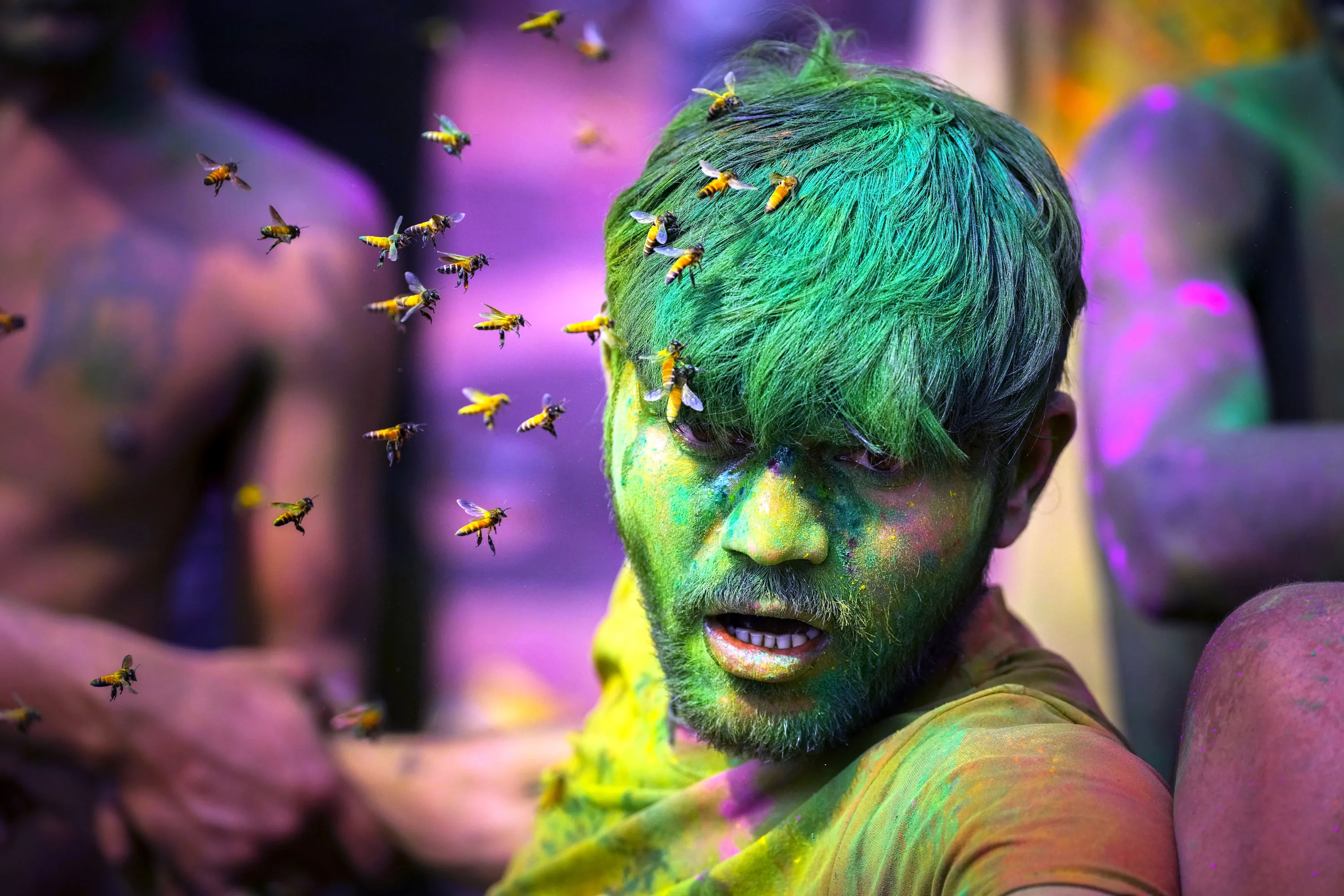 A swarm of bees attack a drunk man during celebrations marking Holi, the Hindu festival of colors, in Guwahati, India, Monday, March 25, 2024. (Photo by Anupam Nath/AP Photo)
