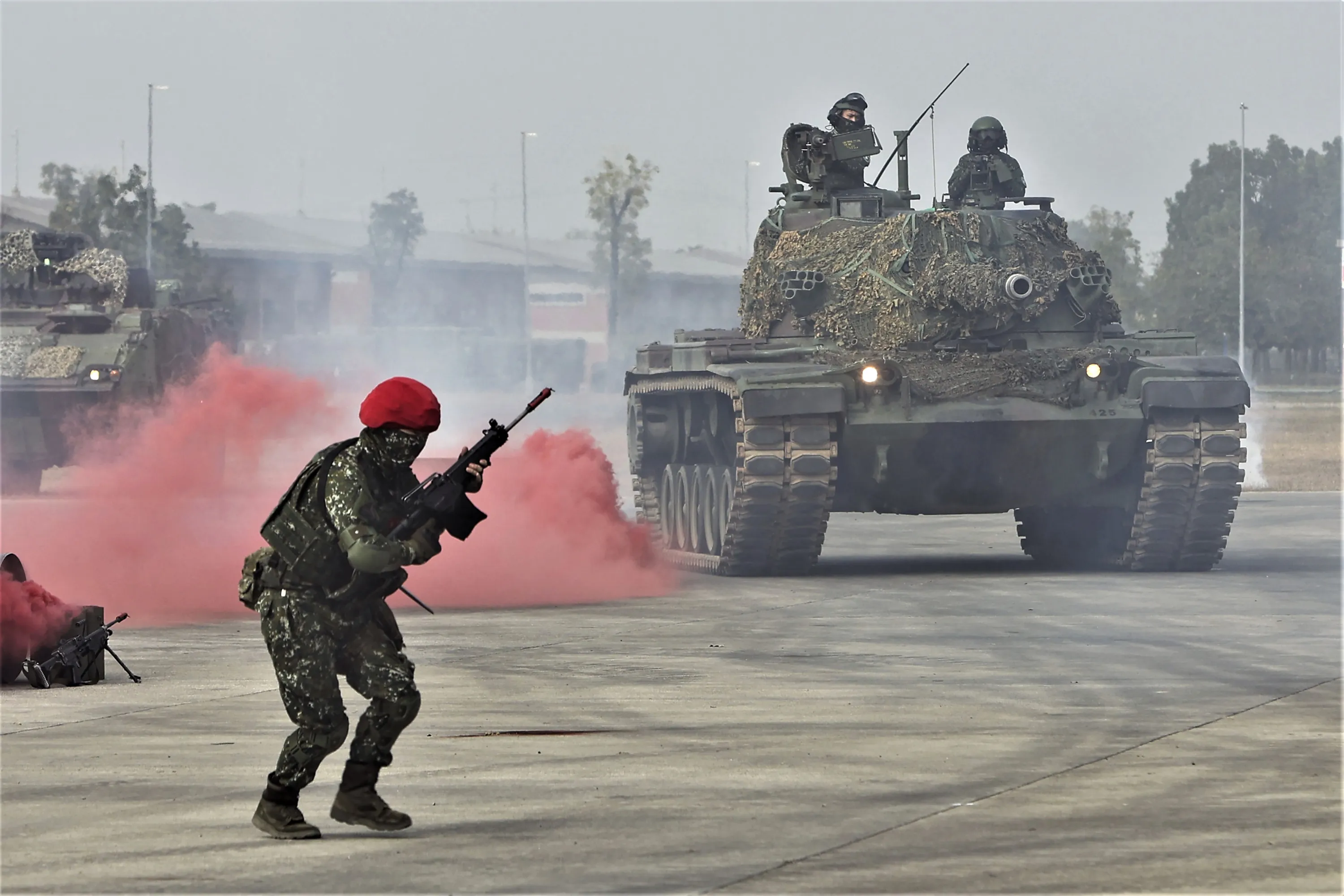 A solider reacts as a tank approaches during a preparedness enhancement drill simulating the defense against Beijing's military intrusions, ahead of the Lunar New Year in Kaohsiung City, Taiwan on Wednesday, January 11, 2023. China renewed its threats Wednesday to attack Taiwan and warned that foreign politicians who interact with the self-governing island are “playing with fire”. (Photo by Daniel Ceng/AP Photo)
