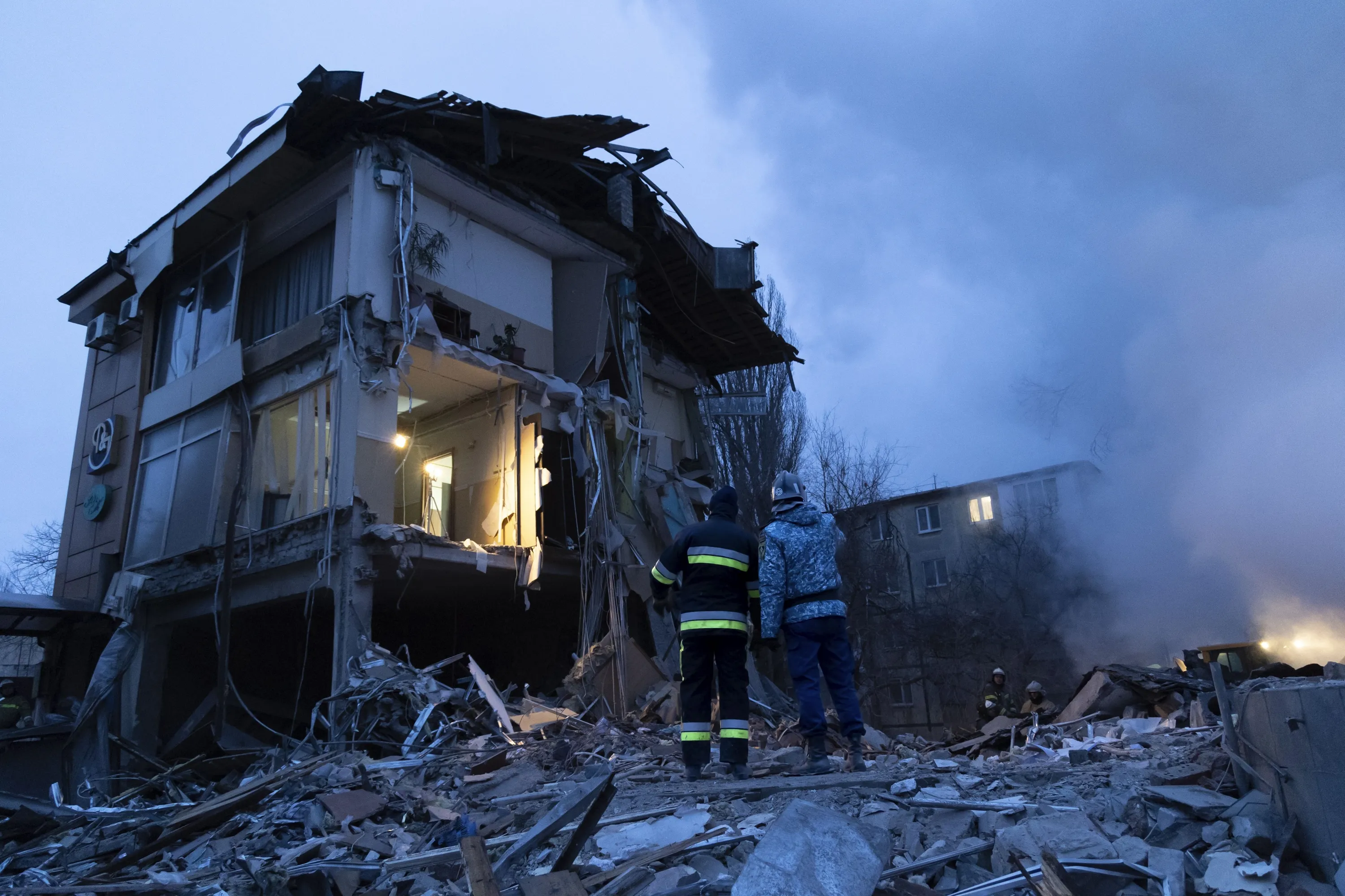 Smoke rises as Donetsk's emergency employees work at a site of a shopping center destroyed following what Russian officials in Donetsk said it was a shelling by Ukrainian forces, in Donetsk, in Russian-controlled Donetsk region, eastern Ukraine, Monday, January 16, 2023. (Photo by Alexei Alexandrov/AP Photo)