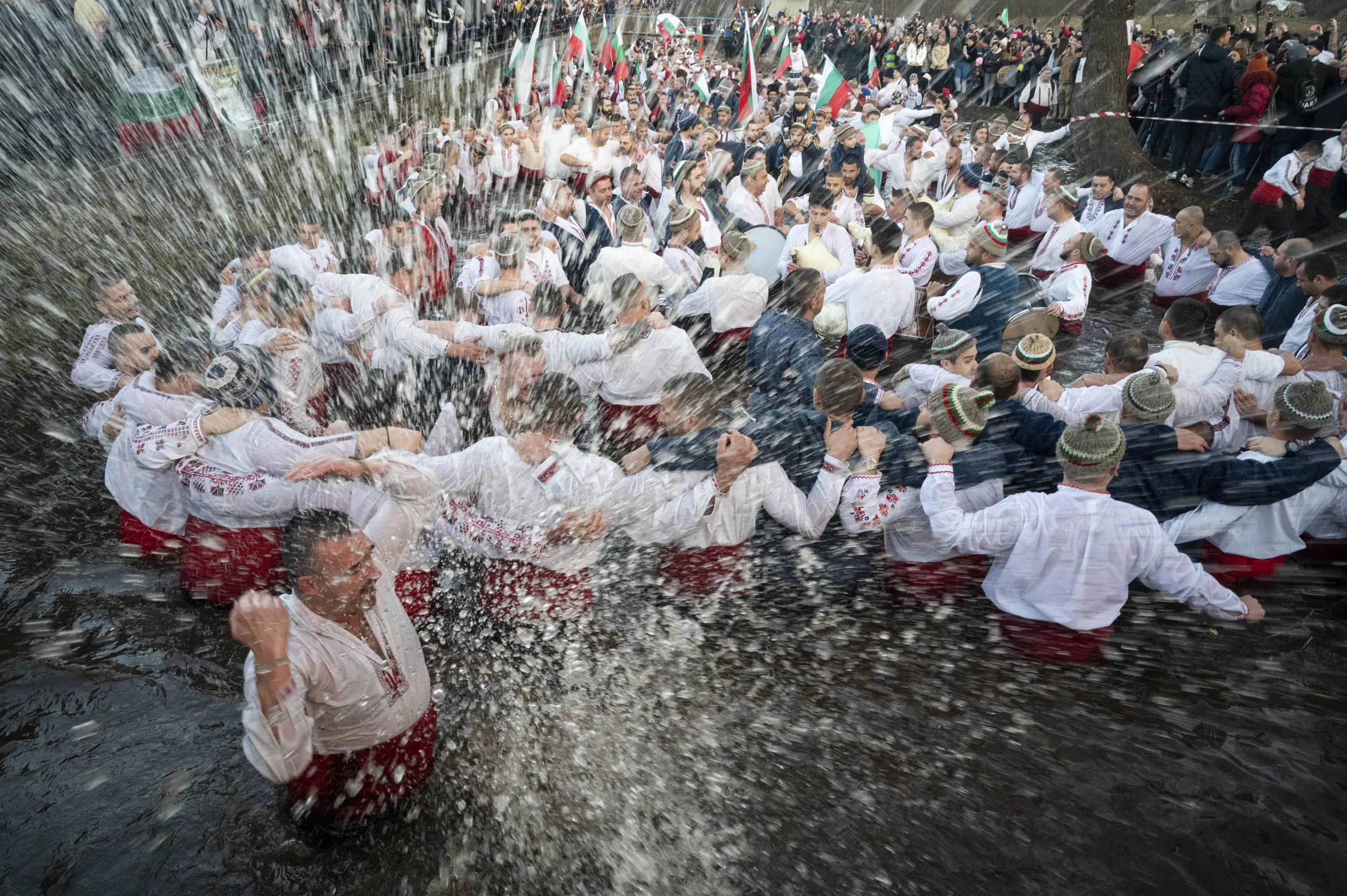 Bulgarian men perform the traditional “Horo” dance in the winter waters of the Tundzha river in the town of Kalofer, as part of Epiphany Day celebrations on January 6, 2023. As a tradition, an Eastern Orthodox priest throws a cross in the river and it is believed that the one who retreives it will be healthy throughout the year as well as all those who dance in the icy waters. (Photo by Nikolay Doychinov/AFP Photo)