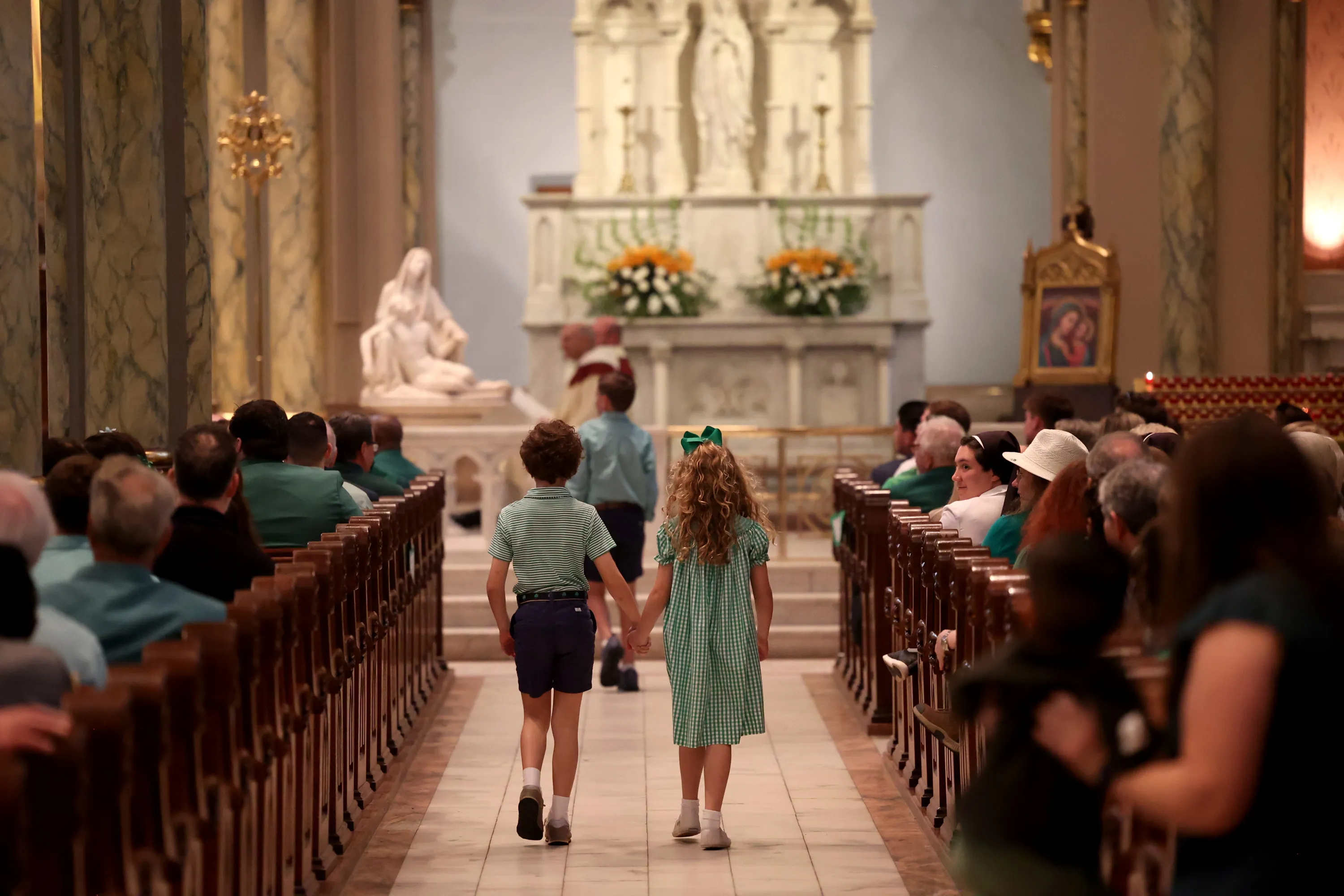 Children walk down the aisle during the St. Patrick's Day Mass on Saturday, March 16, 2024 at the Cathedral Basilica of St. John The Baptist in Savannah, Georgia. (Photo by Richard Burkhart, USA Today Network)