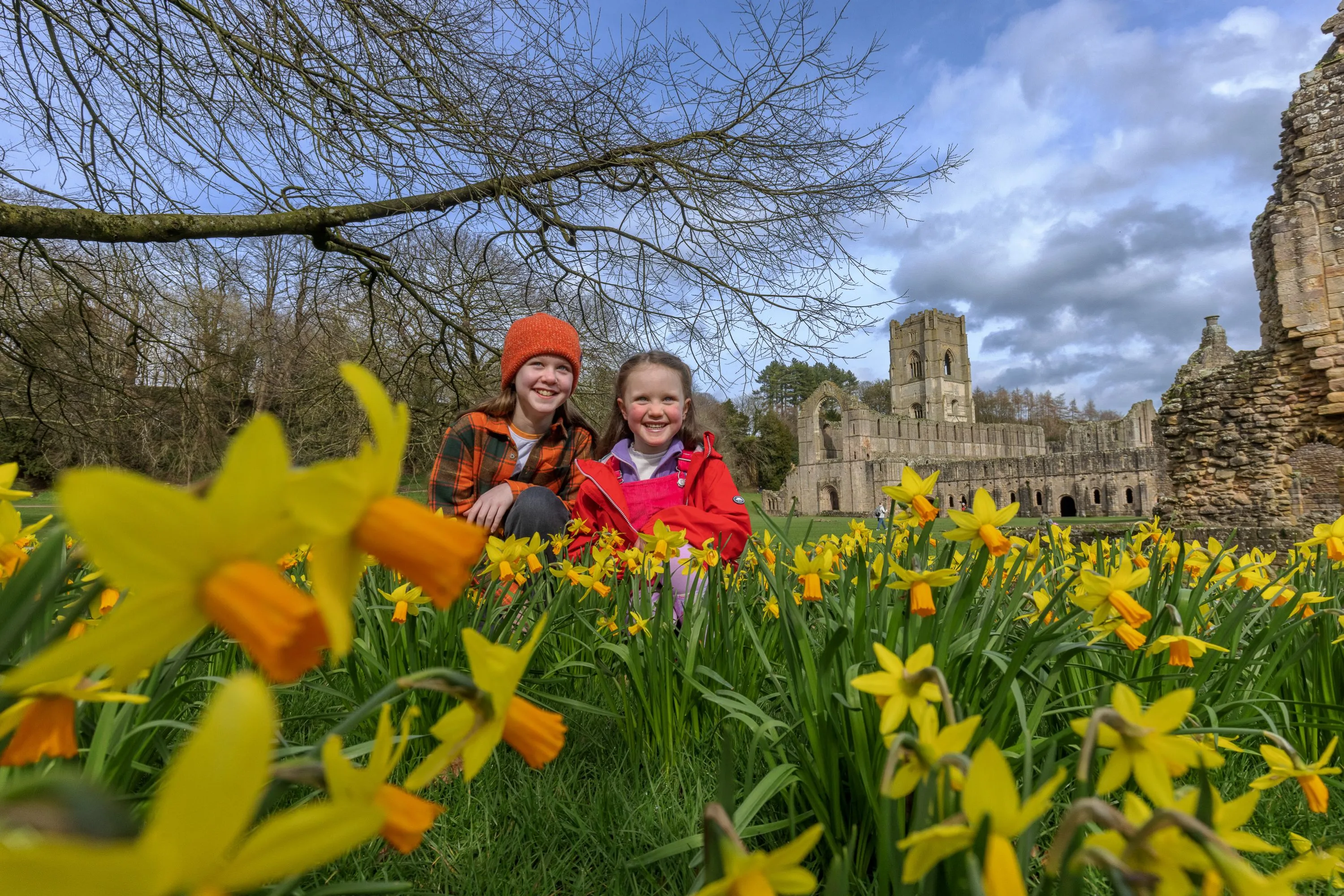 Erin and Robyn Smith admire the daffodils at Fountains Abbey near Ripon, North Yorkshire, United Kingdom on March 16, 2024. (Photo by James Glossop/The Times)
