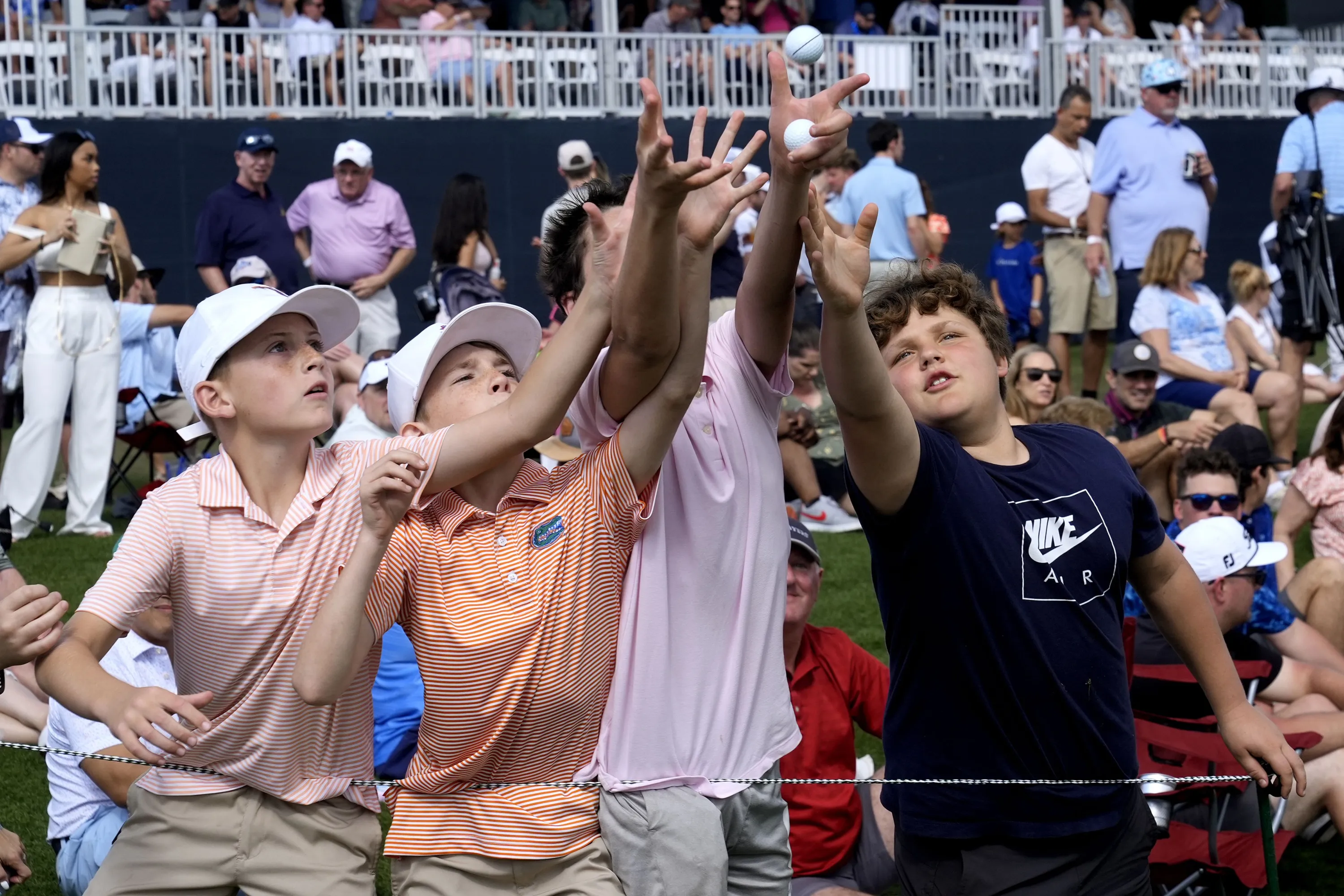 Young golf fans reach for a ball thrown by a player on the 17th green during the third round of The Players Championship golf tournament Saturday, March 16, 2024, in Ponte Vedra Beach, Fla. (Photo by Marta Lavandier/AP Photo)