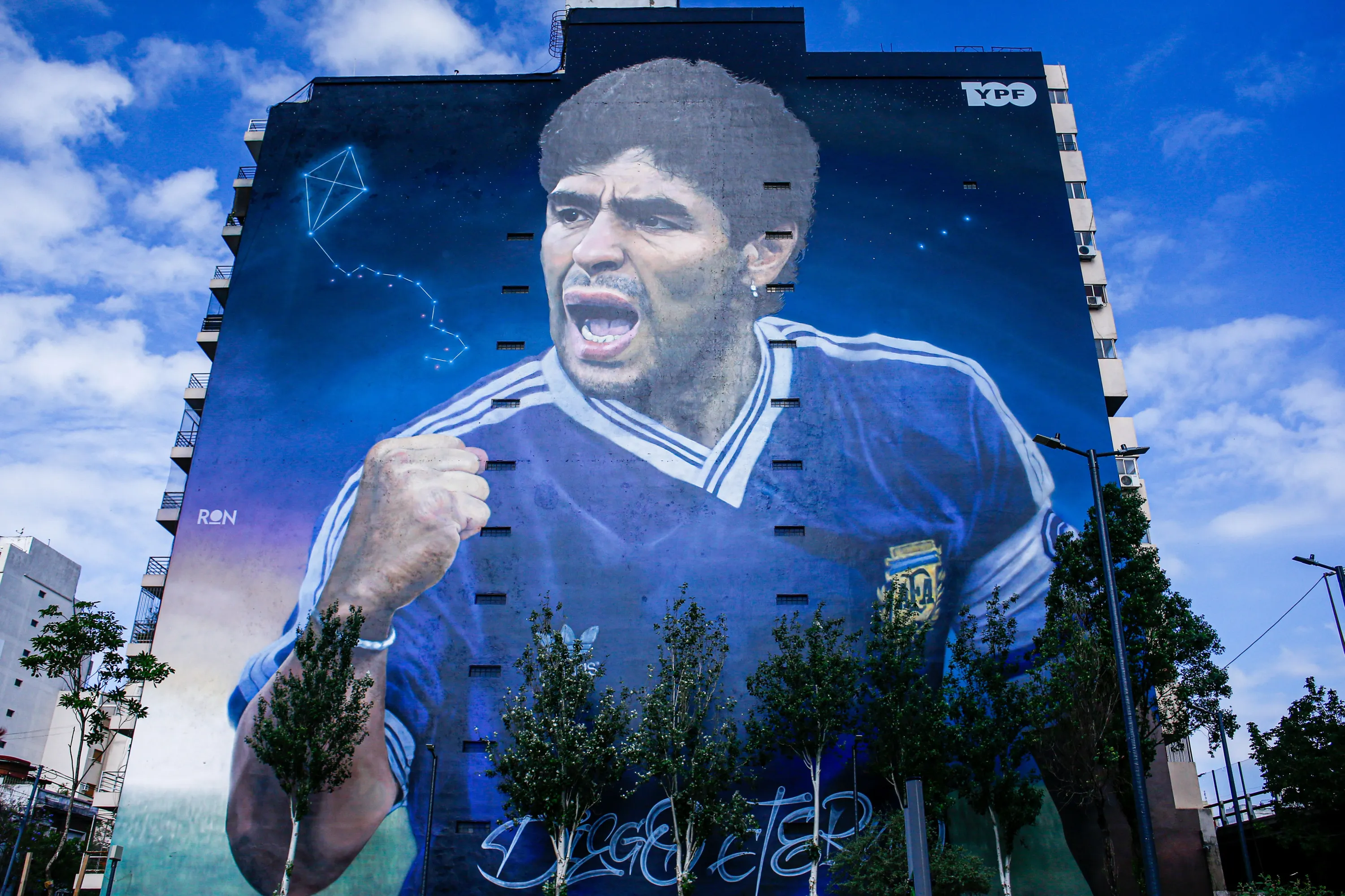 A view of a giant Diego Maradona mural created by artist Martin Ron from his series of murals called the “Capitanes” in Buenos Aires, Argentina, on December 14, 2023. Martin Ron has created both Diego Maradona and Leonel Messi's murals to pay tribute for the two great footballers who led Argentina to victory on 1986 and 2022 FIFA World Cup. (Photo by Luciano Gonzalez/Anadolu via Getty Images)