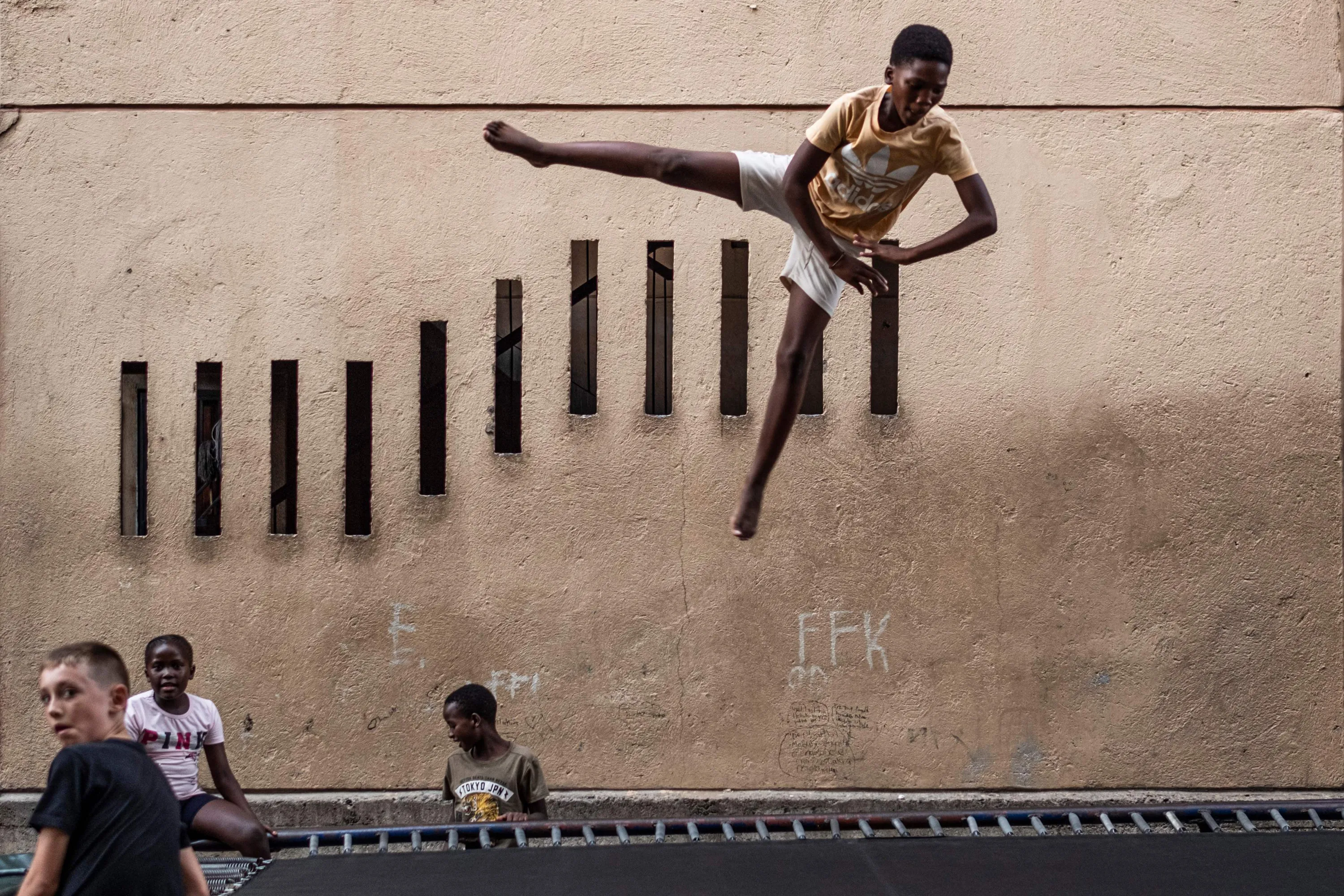 A child jumps on a trampoline as others wait their turn in Alexandra near Johannesburg on March 9, 2024. (Photo by Emmanuel Croset/AFP Photo)