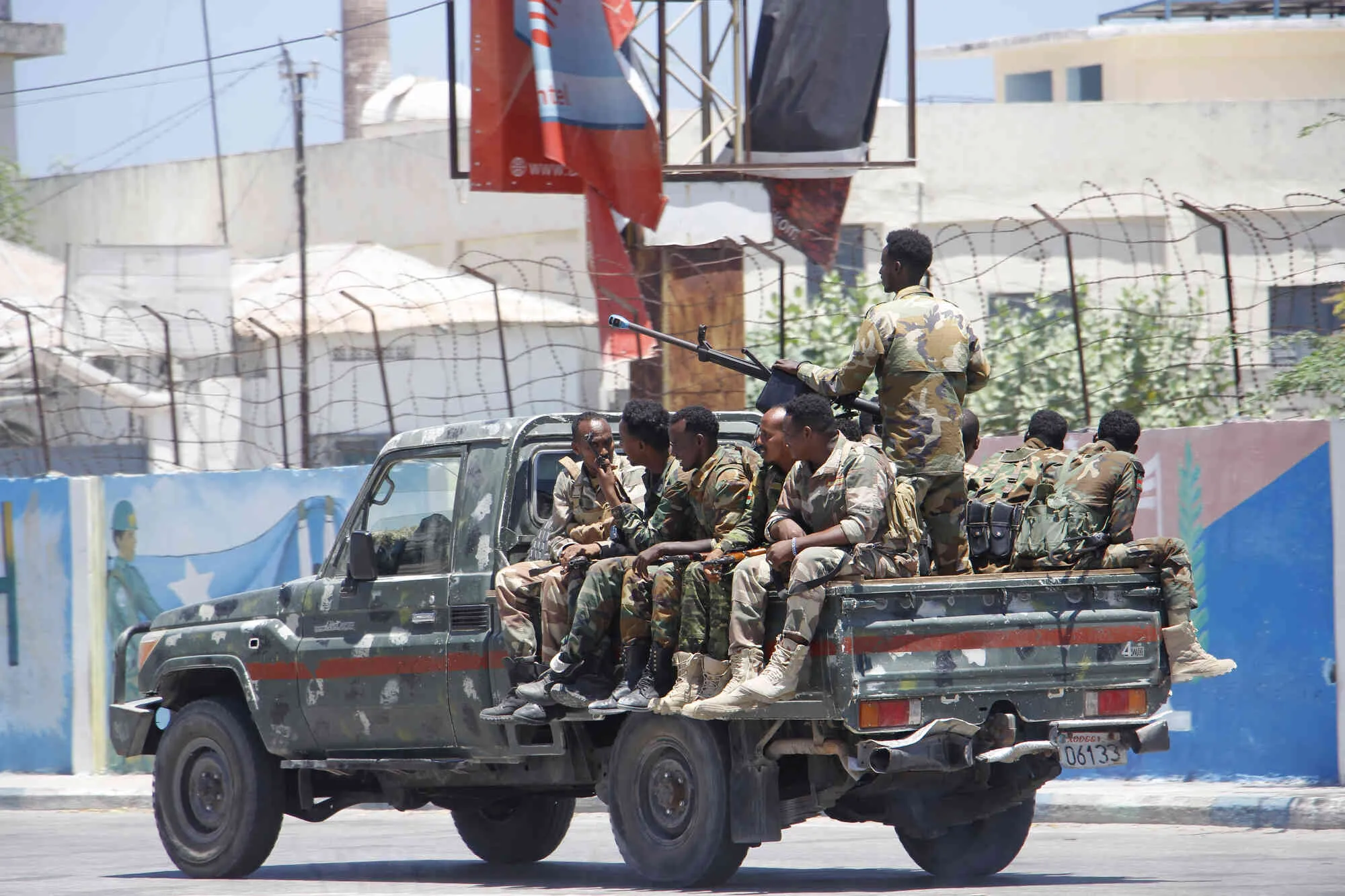Somalia security officers patrol near the SYL hotel building which was attacked on Thursday by al-Shabab Islamic extremist rebels in Mogadishu, Somalia, Friday March 15, 2024. The Somali extremist group al-Shabab said its fighters have attacked a hotel in the capital Mogadishu, where a loud explosion and gunfire were heard Thursday night. (Photo by Farah Abdi Warsameh/AP Photo)