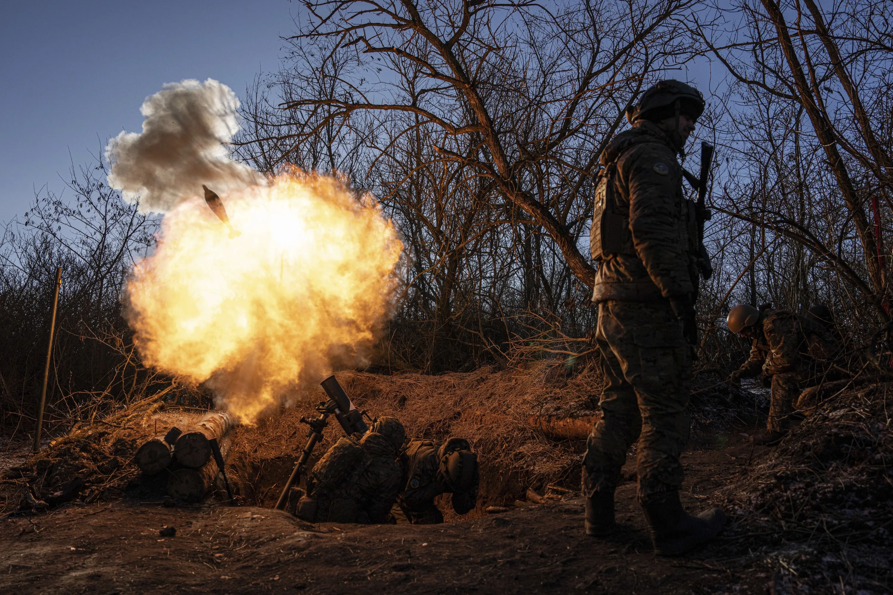 Ukrainian servicemen fire a 120mm mortar towards Russian positions at the frontline near Bakhmut, Donetsk region, Ukraine, Wednesday, January 11, 2023. (Photo by Evgeniy Maloletka/AP Photo)