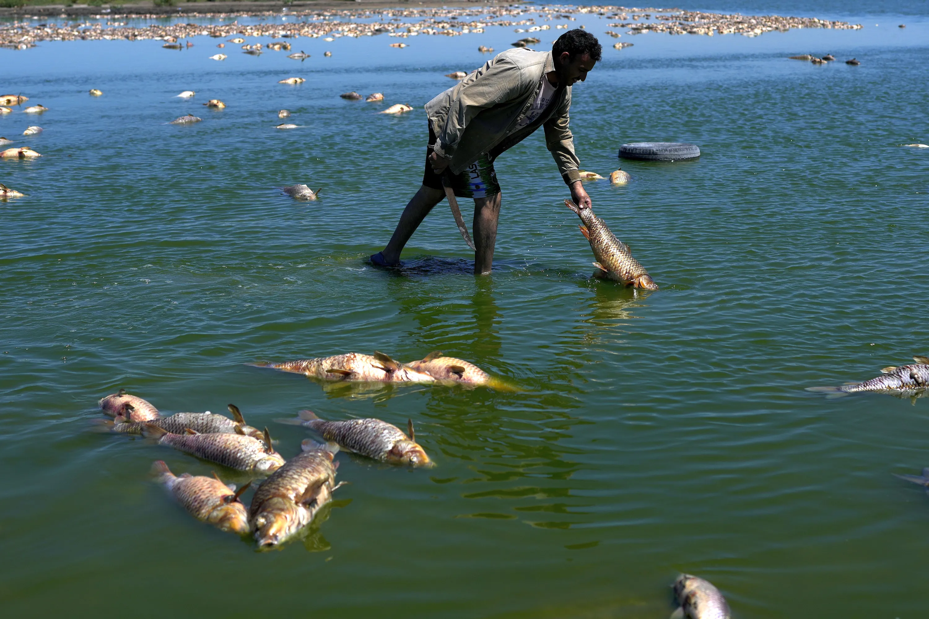 A man searches for fish that are still alive as dead fish agglomerate on the shore of the Salado River during a drought in Buenos Aires province, Argentina, Sunday, January 22, 2023. (Photo by Natacha Pisarenko/AP Photo)