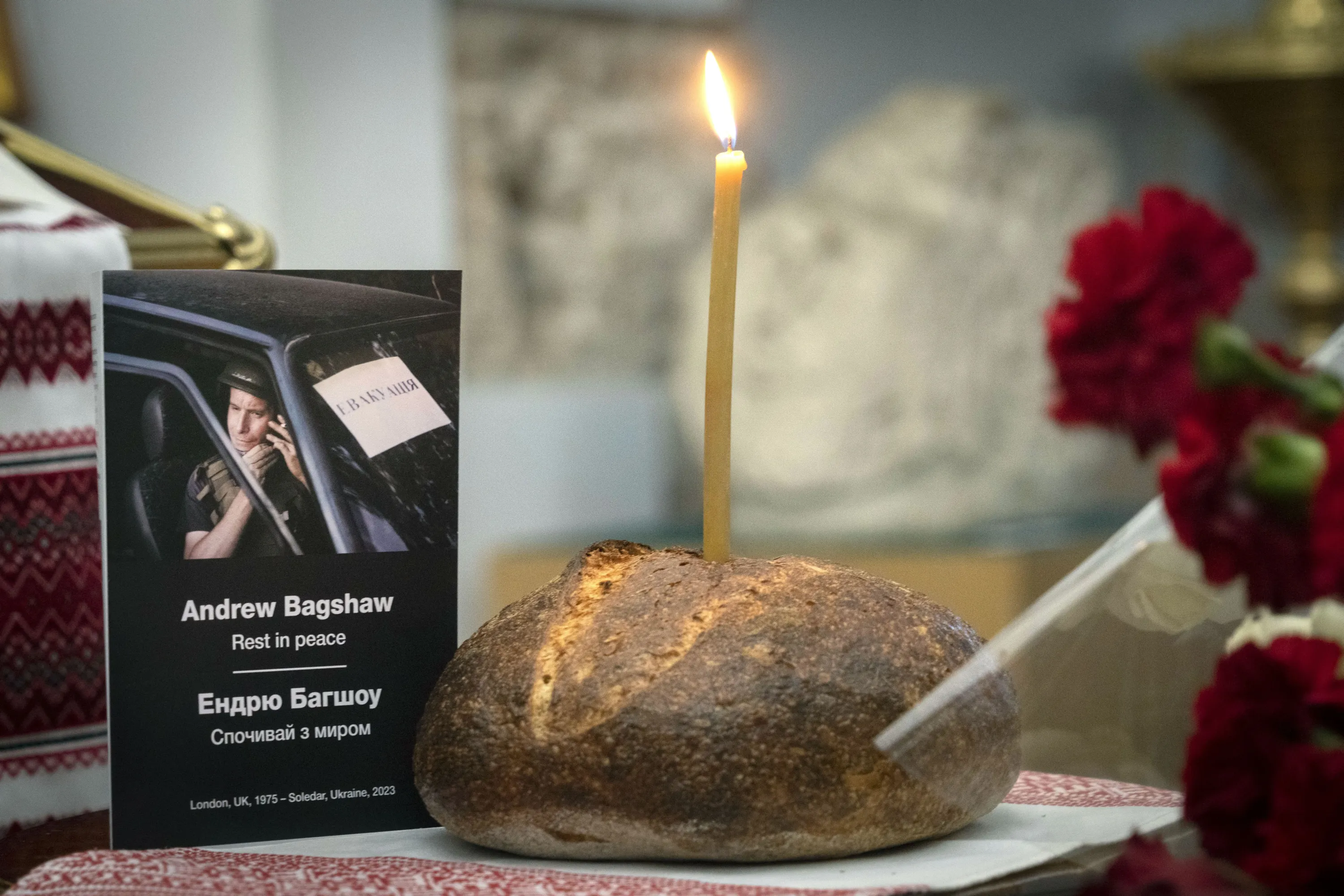 A church candle in a loaf of bread near a photo of Andrew Bagshaw, a British volunteer killed in Ukraine's war-hit east, during commemorating service in a refectory near St. Sophia Cathedral in Kyiv, Ukraine, Sunday, January 29, 2023. Andrew Bagshaw was a dual New Zealand and British citizen who was killed along with British colleague Chris Parry while attempting to rescue an elderly woman from the town of Soledar when their car was hit by an artillery shell. (Photo by Efrem Lukatsky/AP Photo)